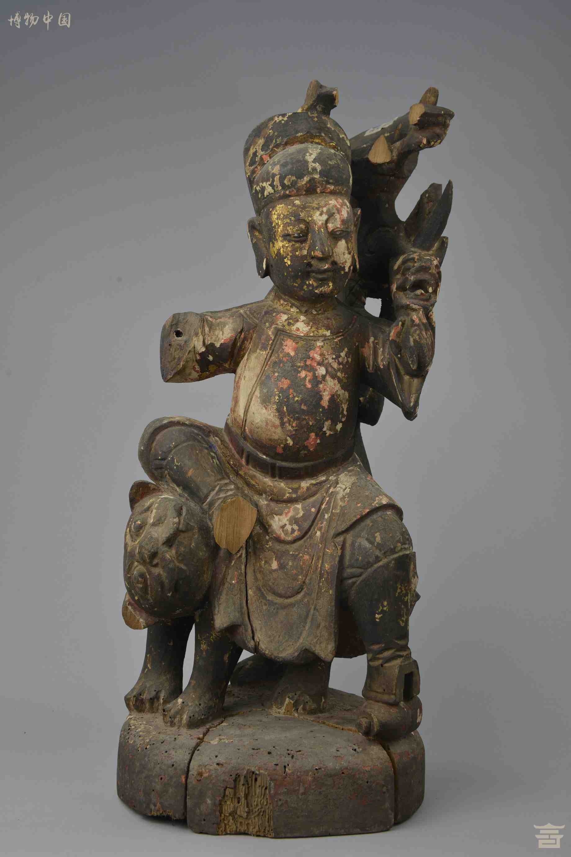 清彩绘漆金木雕武士像