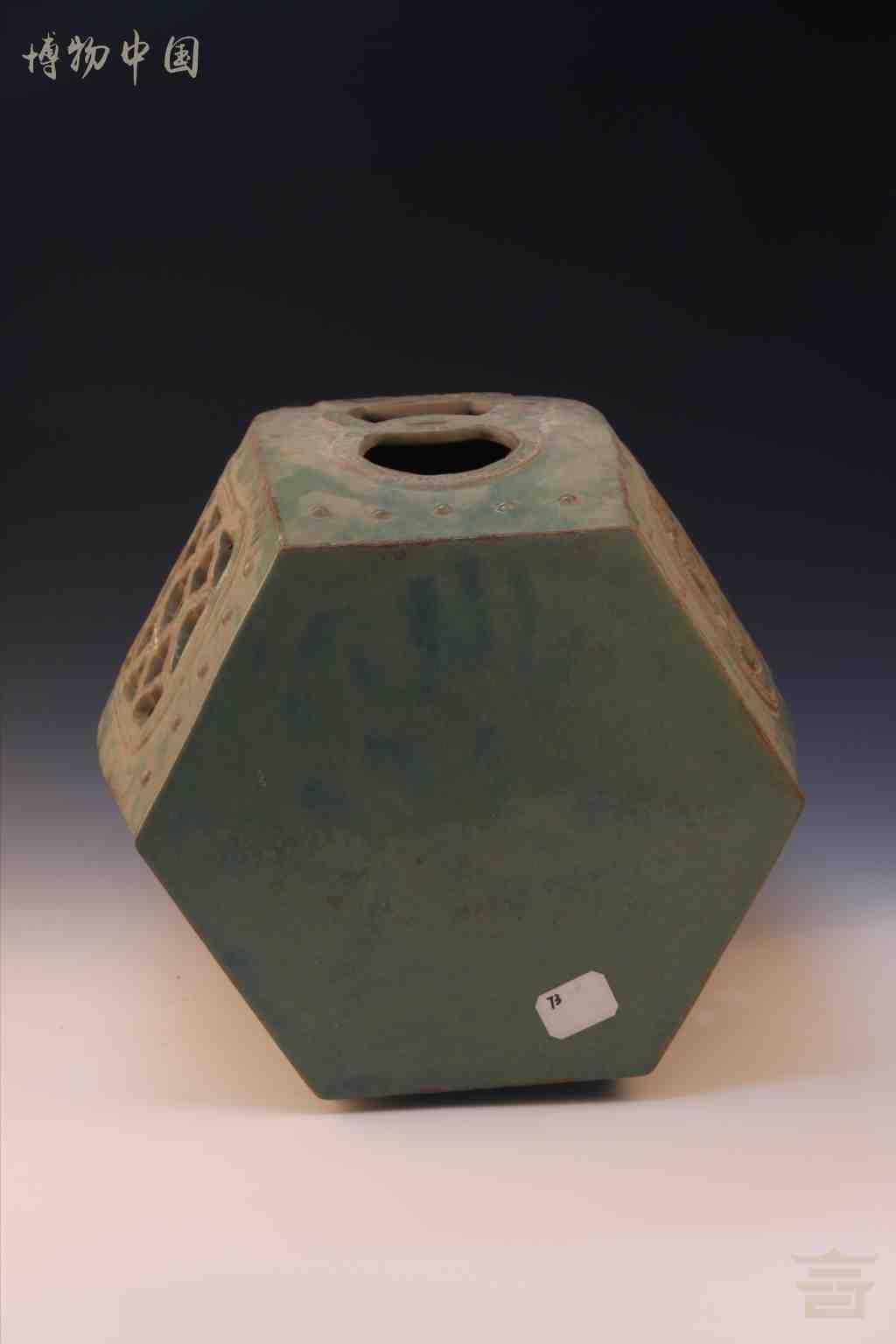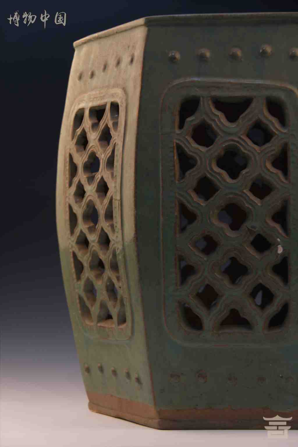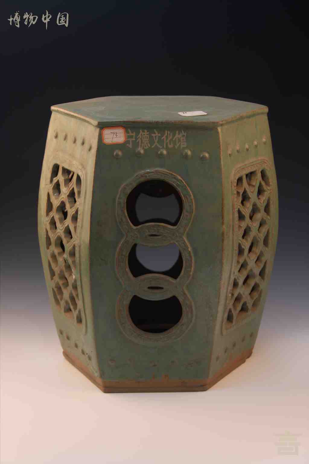 > 清石湾窑绿釉镂雕钱纹六角陶绣墩
