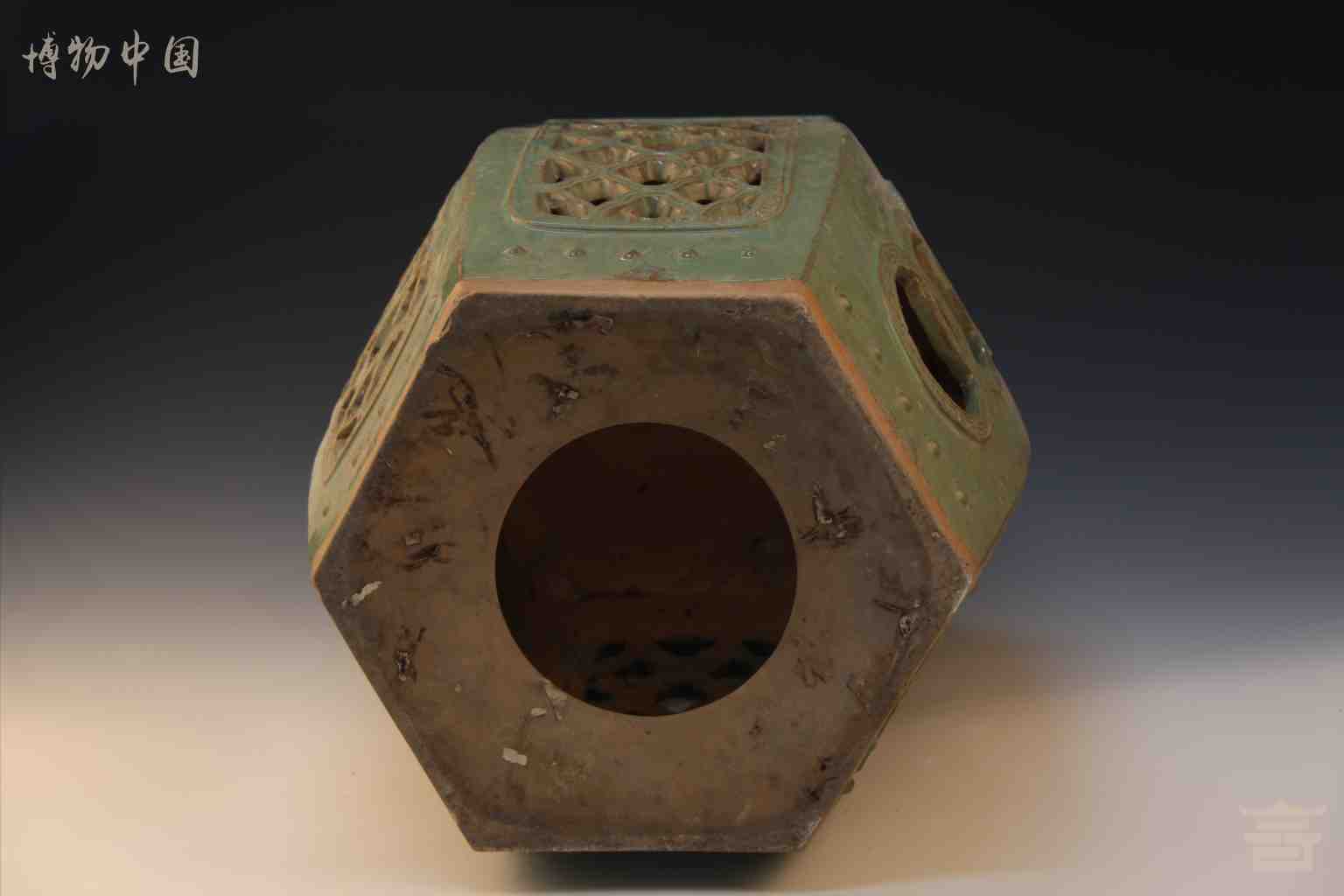 清石湾窑绿釉镂雕钱纹六角陶绣墩