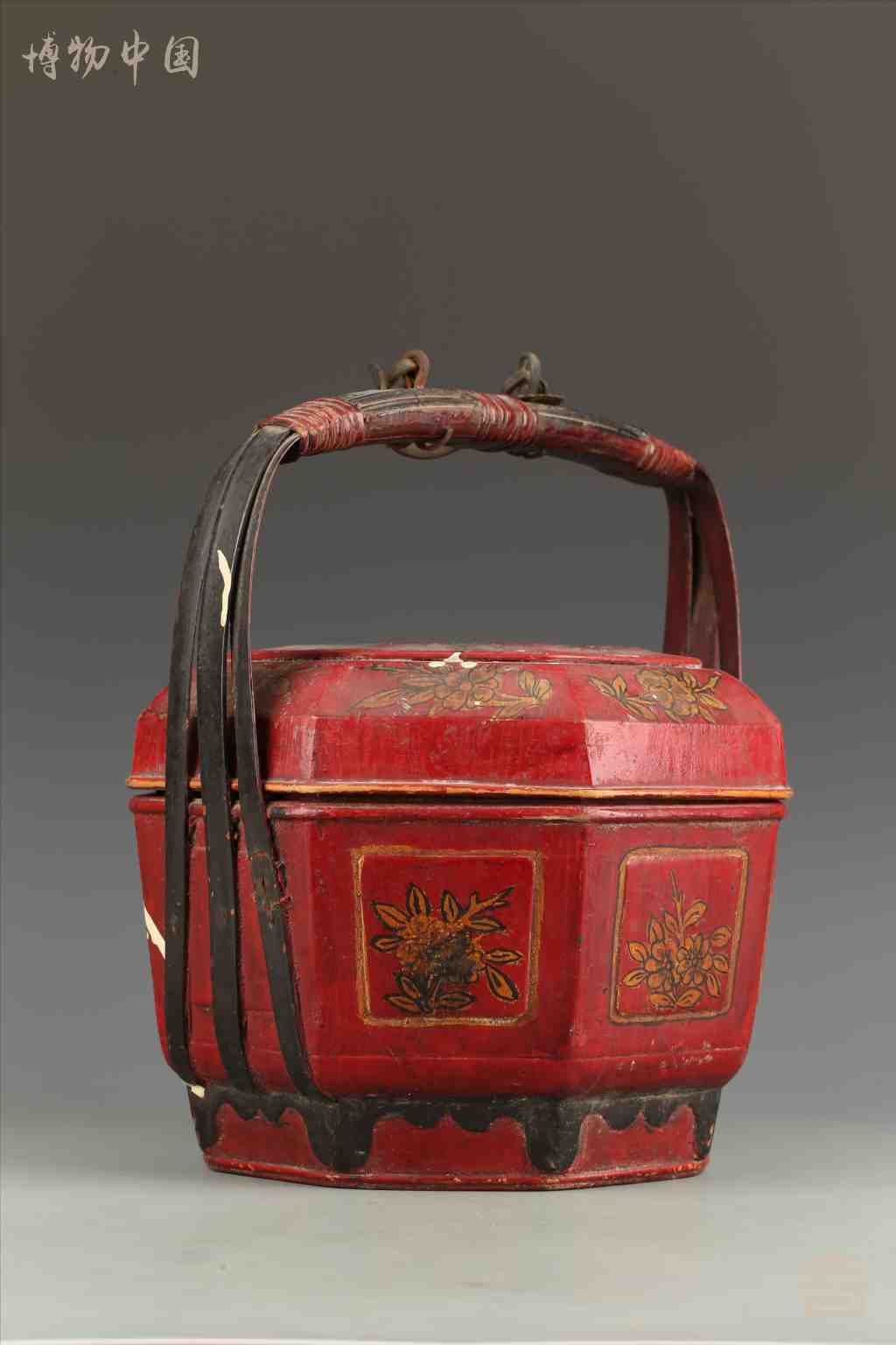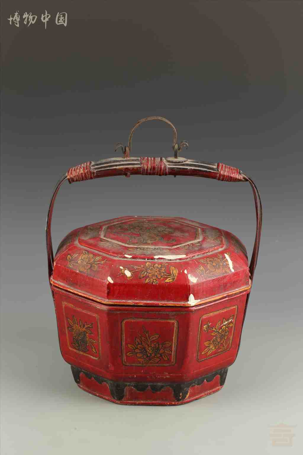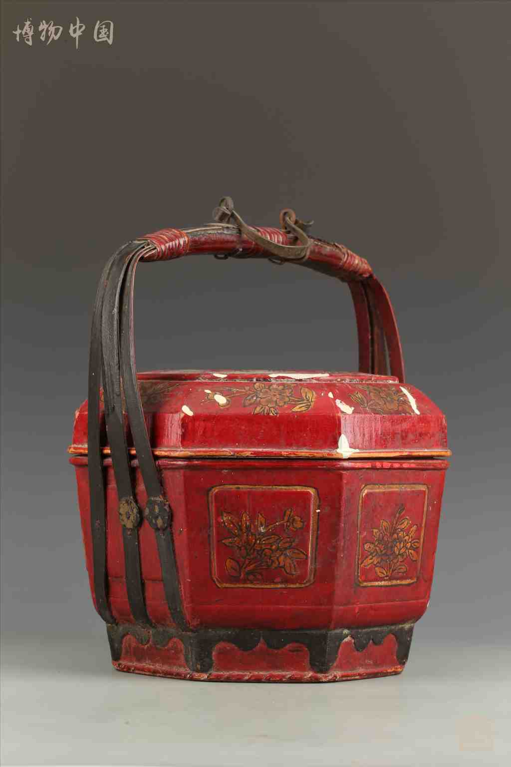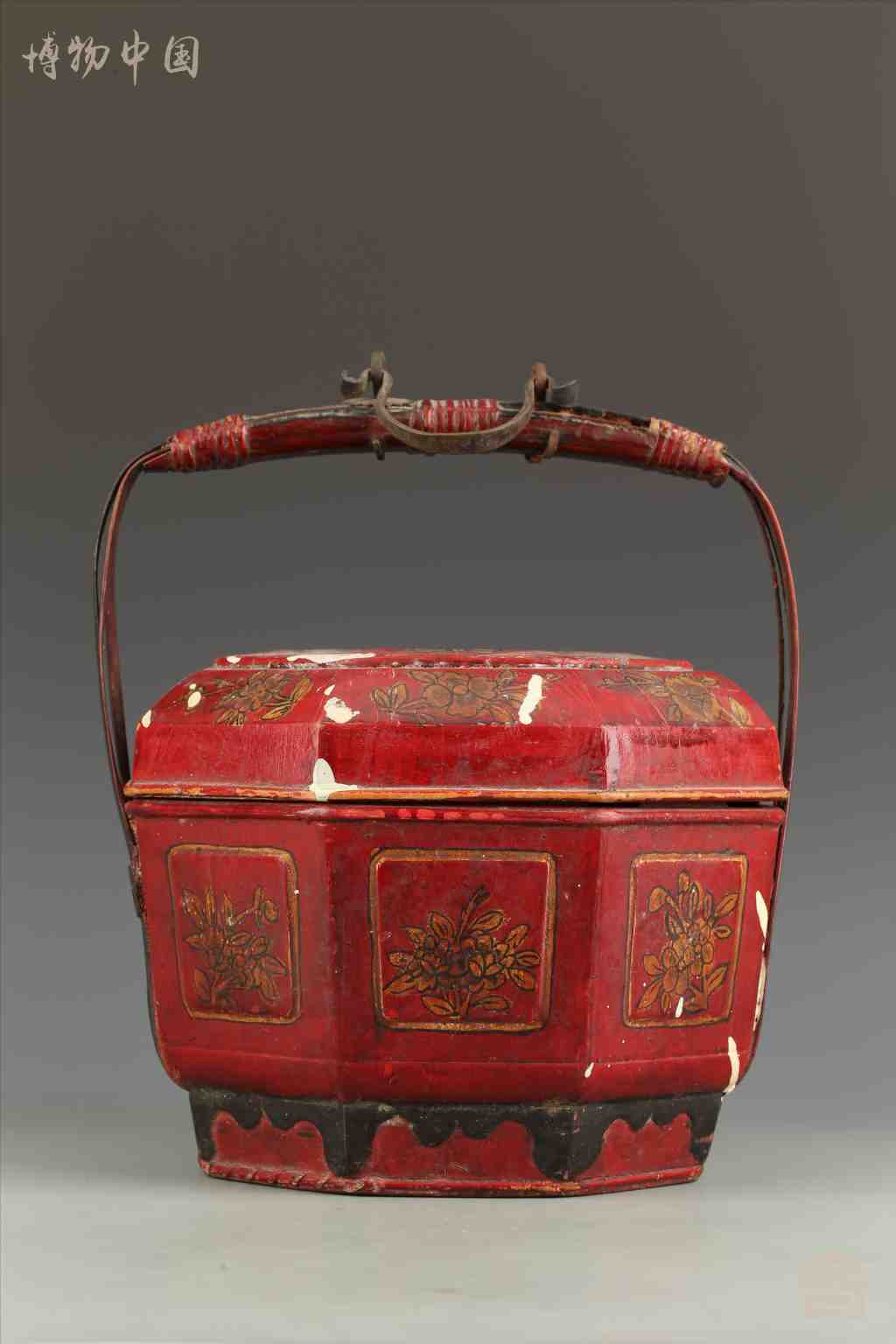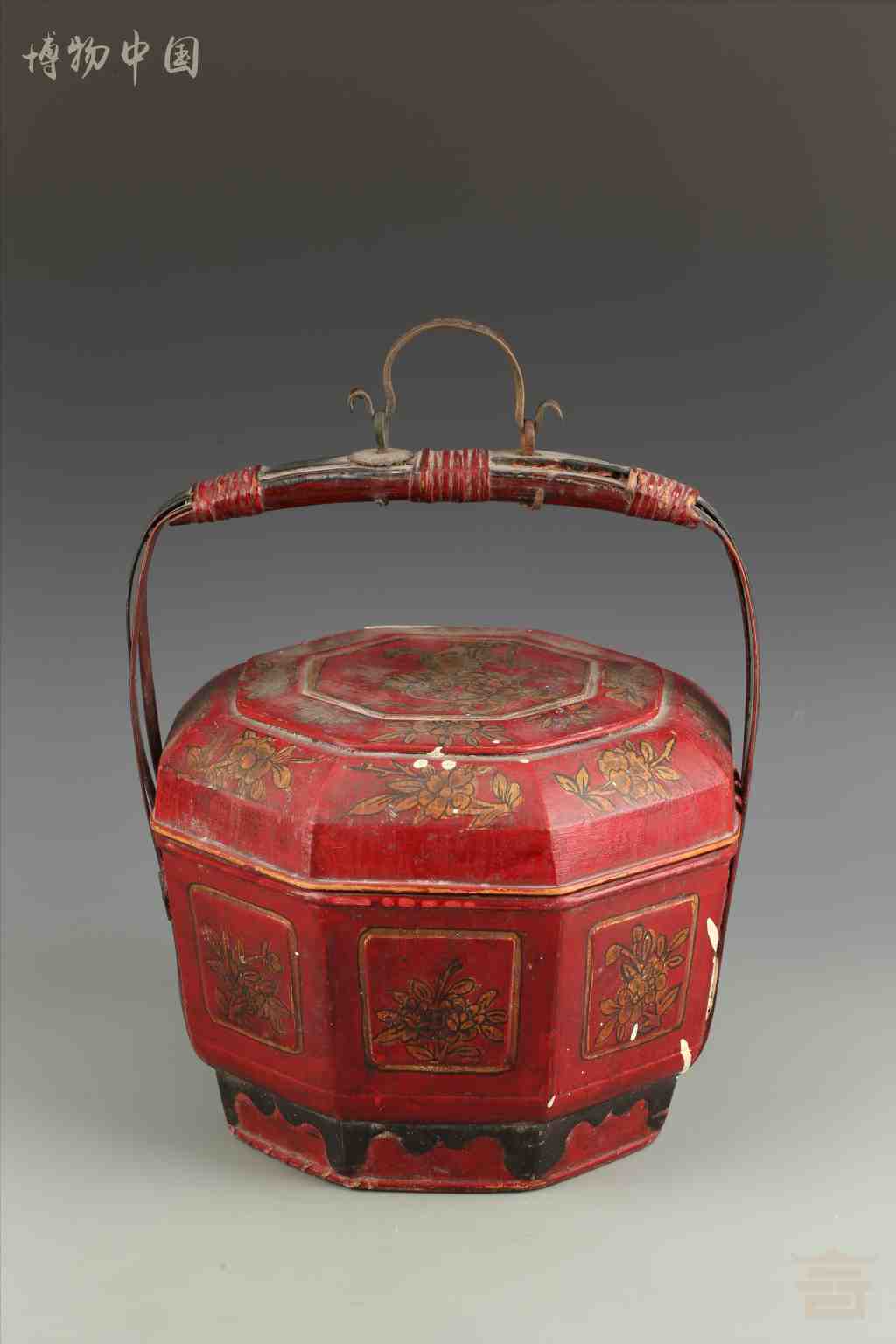 > 民国朱漆彩绘花卉纹八角木提梁盒