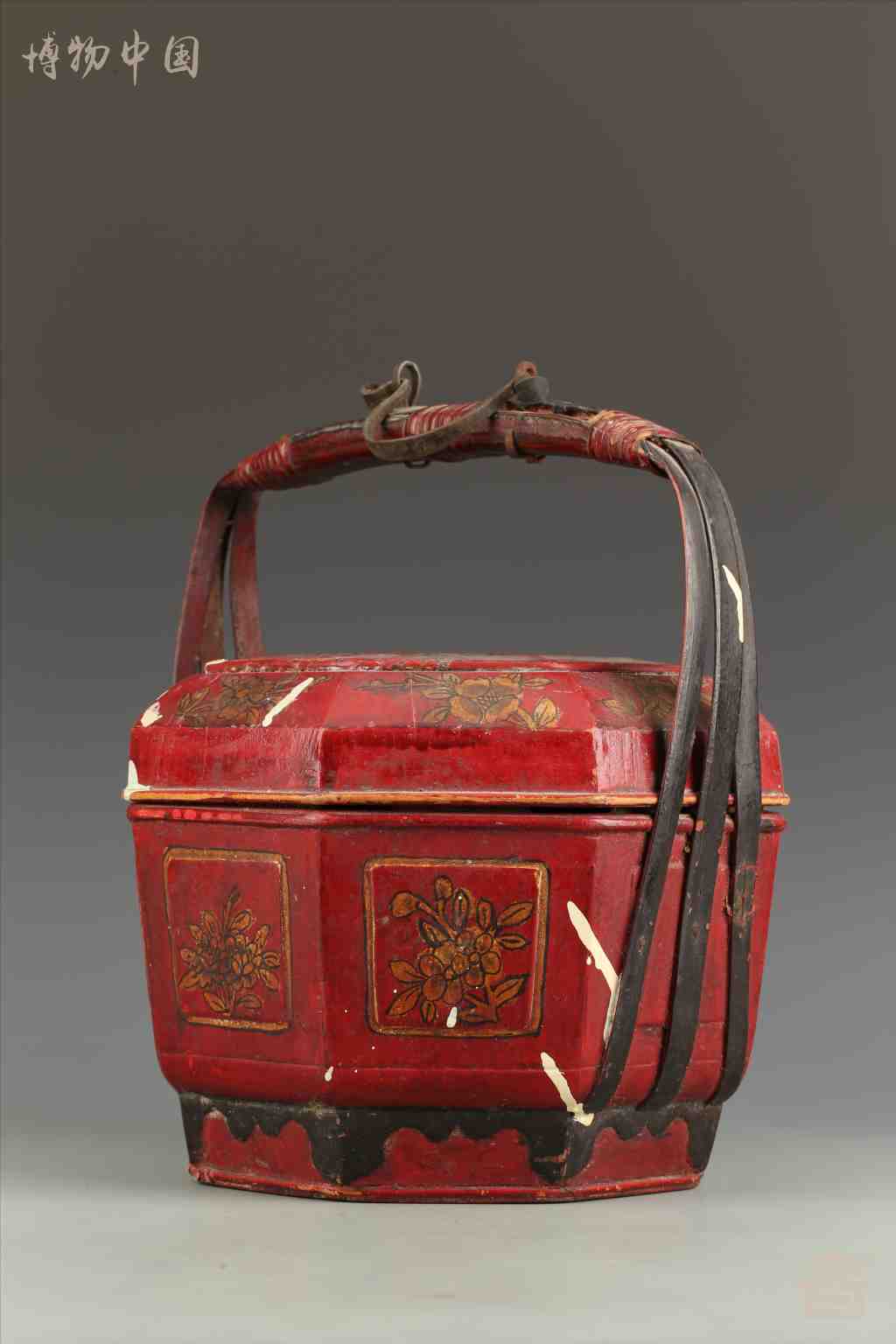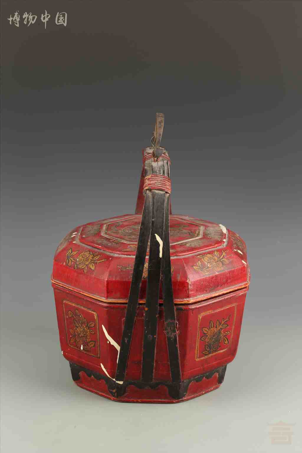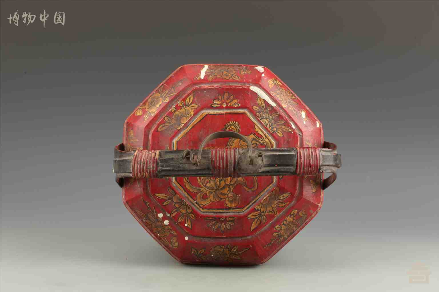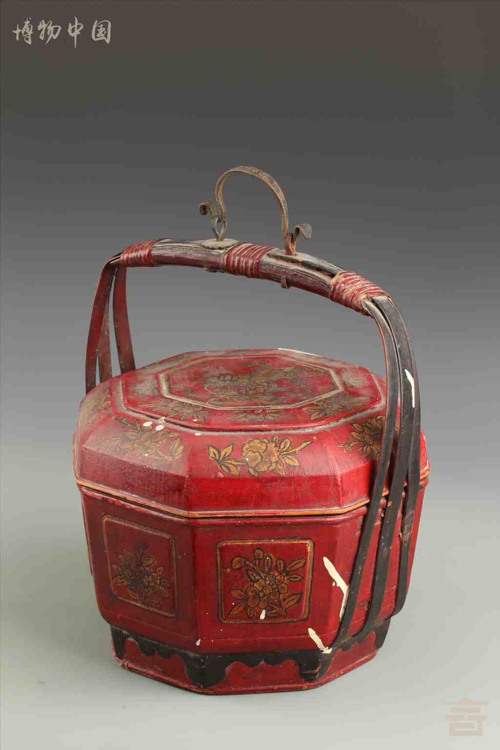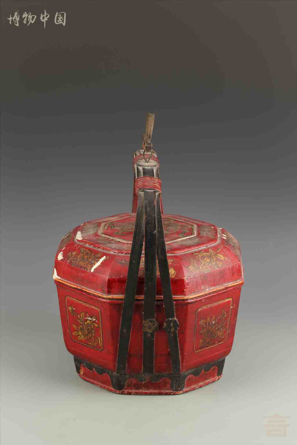 > 民国朱漆彩绘花卉纹八角木提梁盒