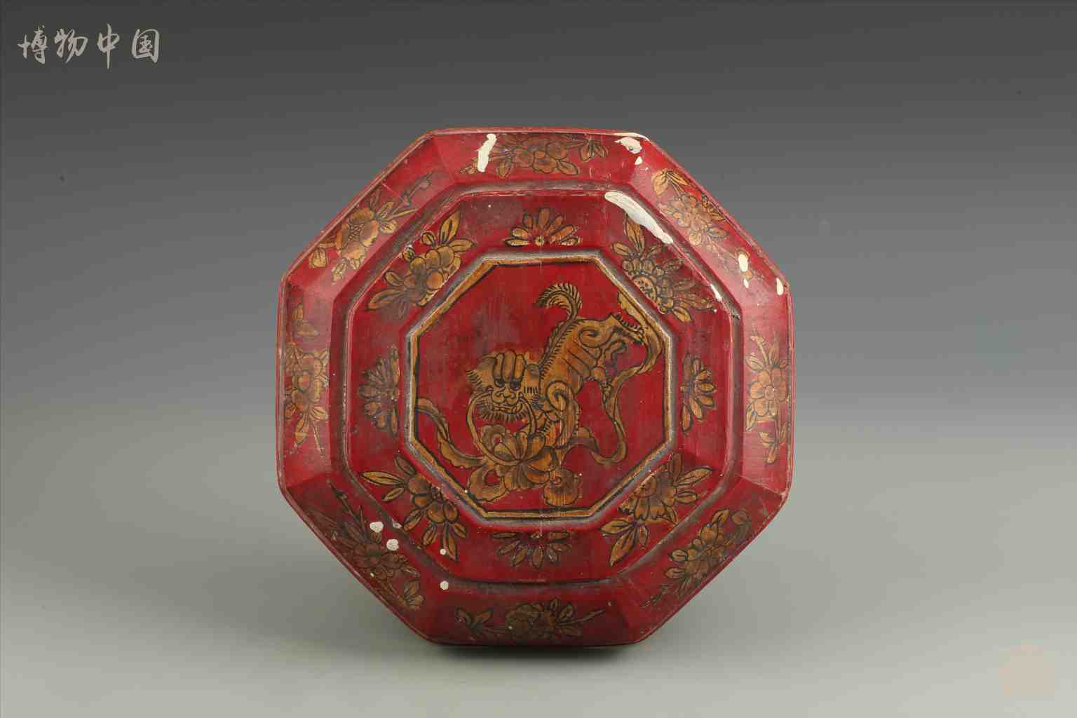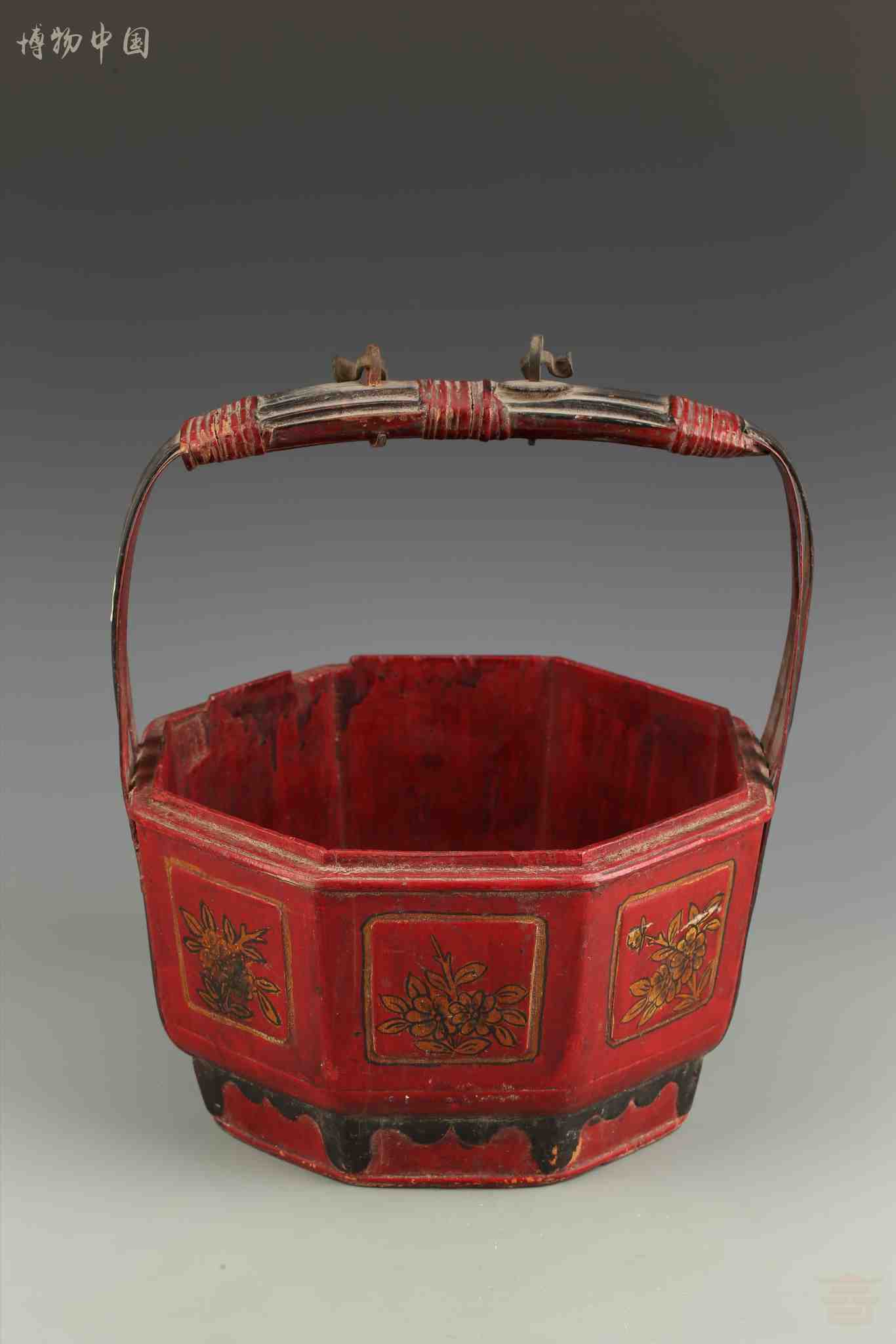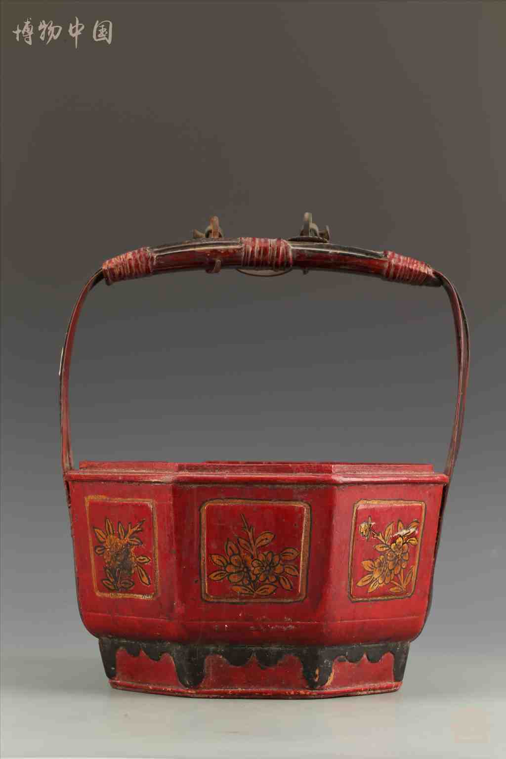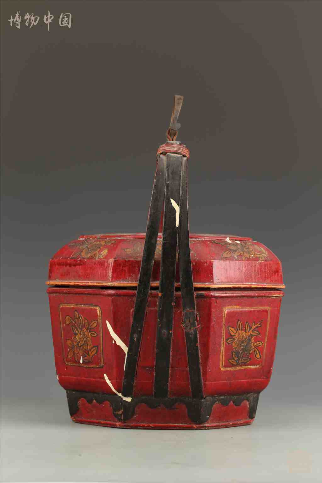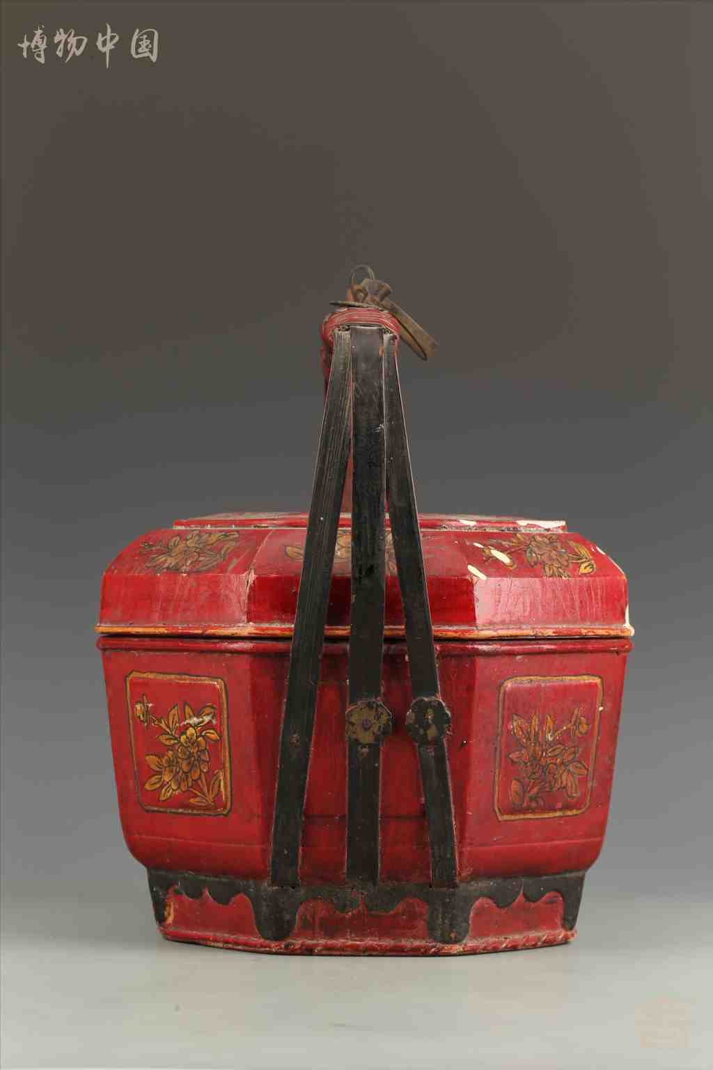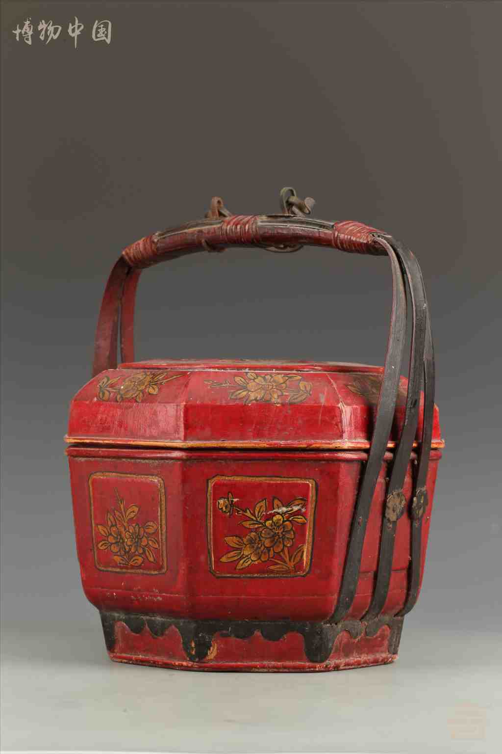 > 民国朱漆彩绘花卉纹八角木提梁盒