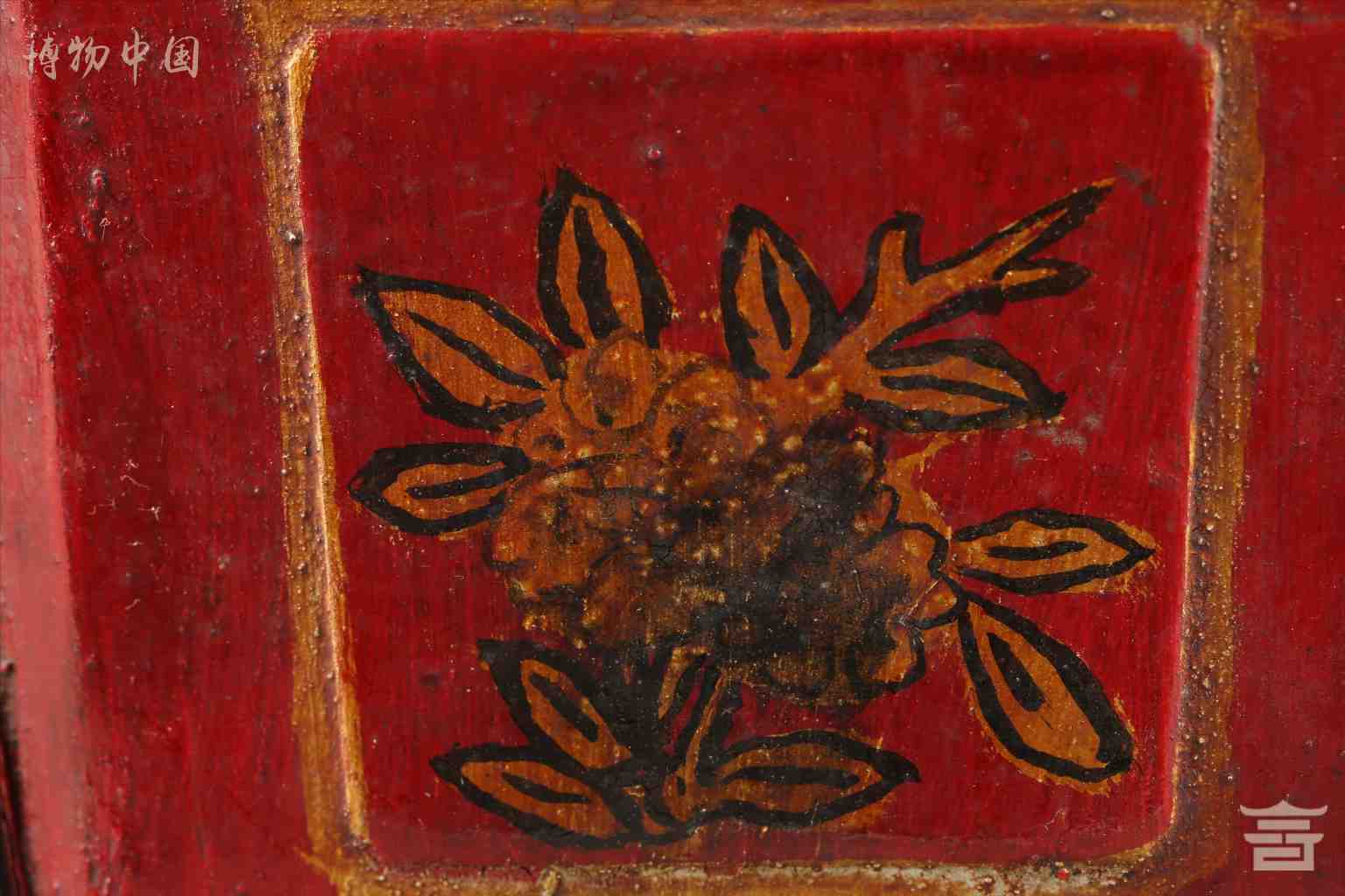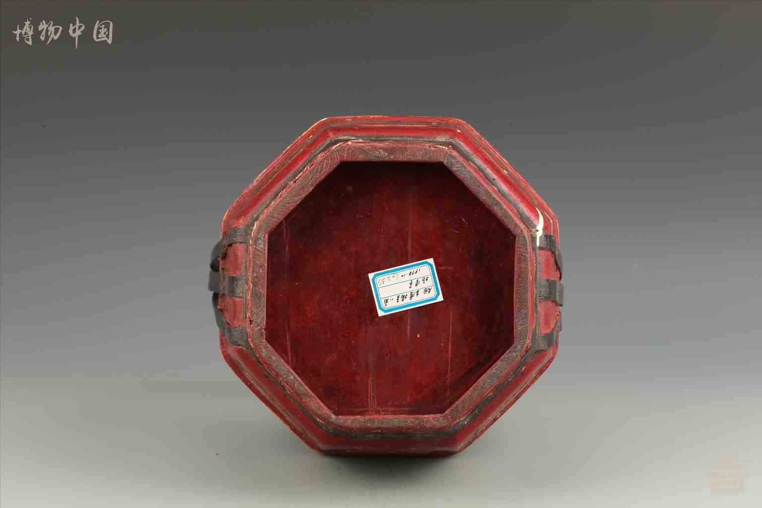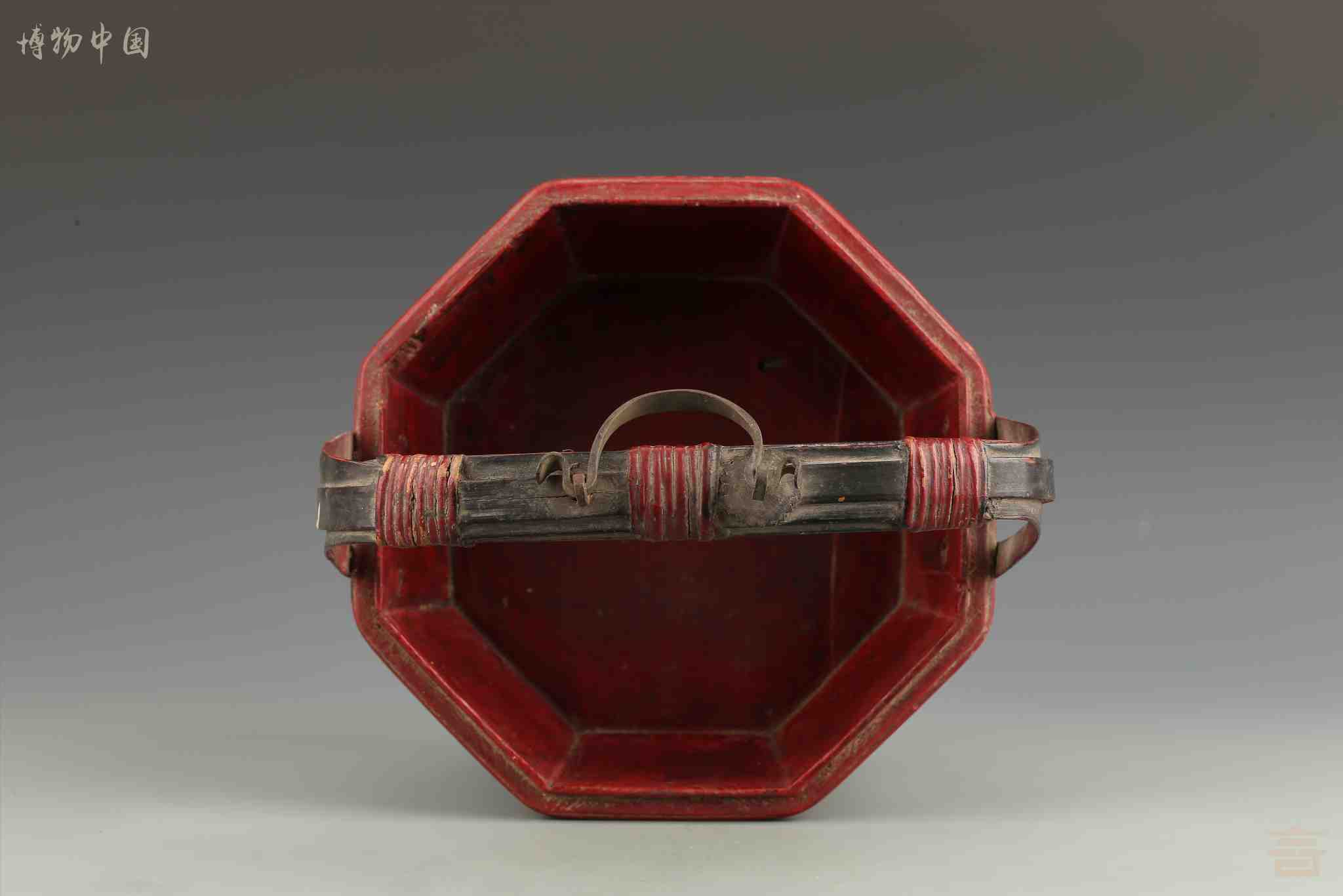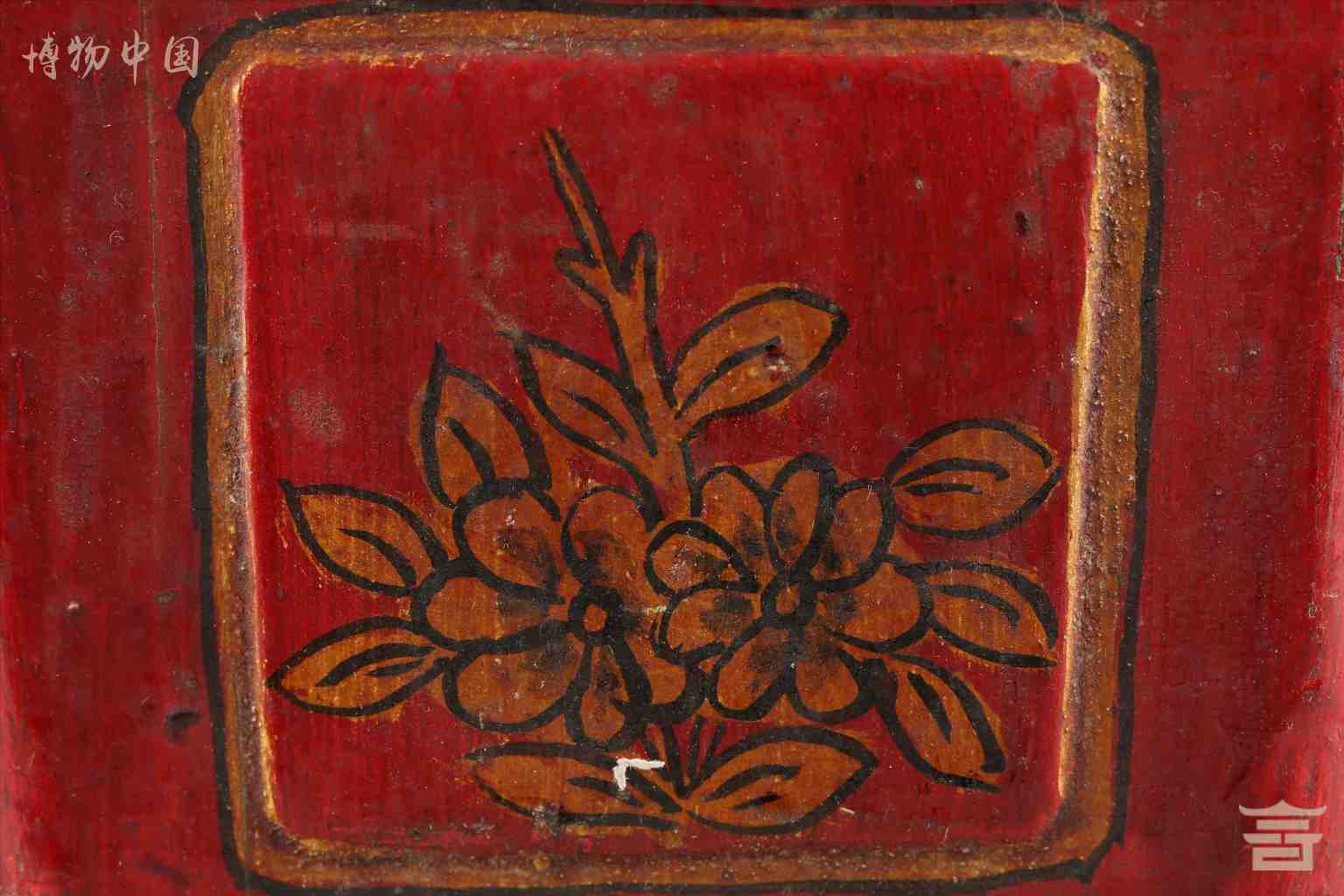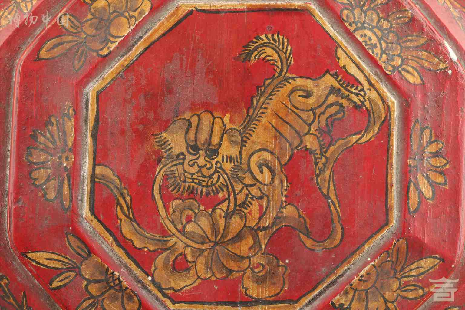 > 民国朱漆彩绘花卉纹八角木提梁盒