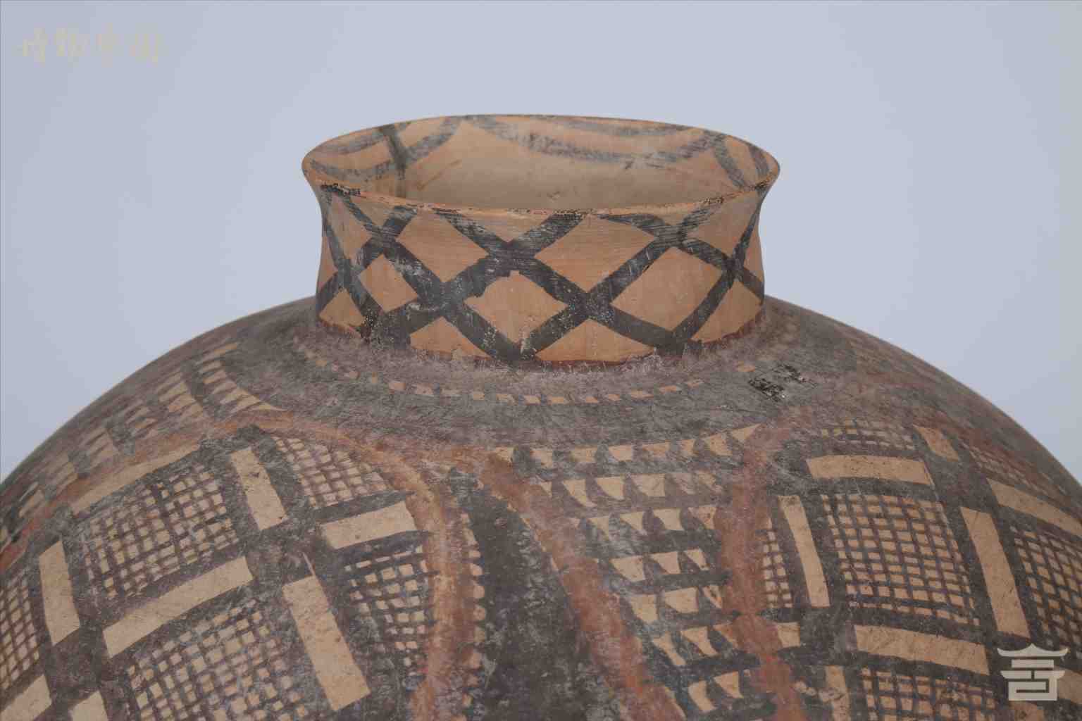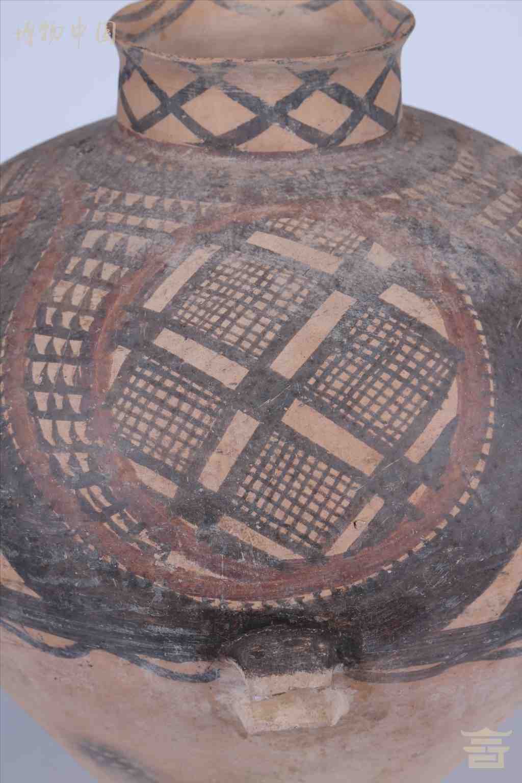 > 新石器时代马家窑文化四大圆圈内方格双耳彩陶壶