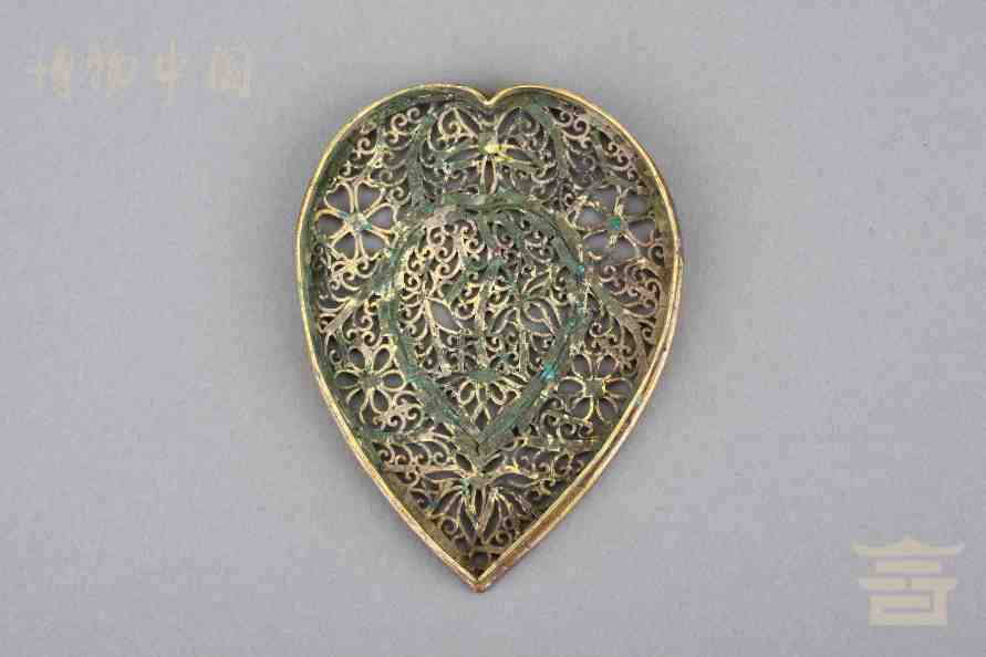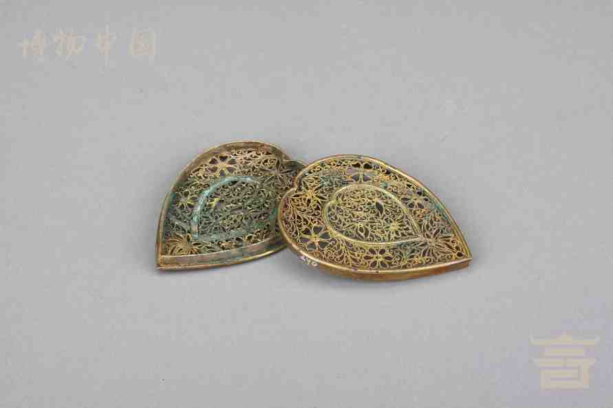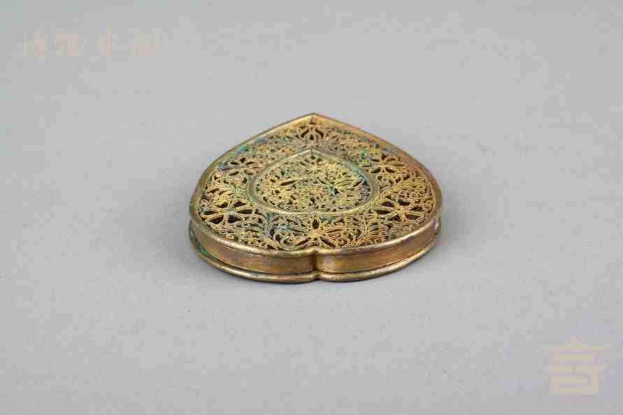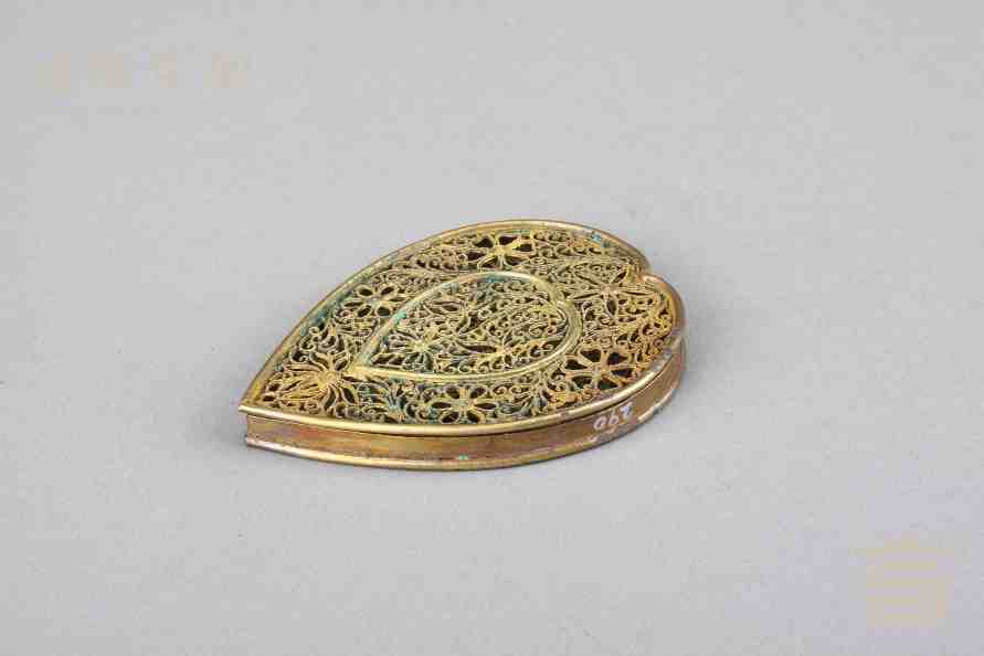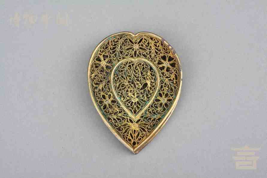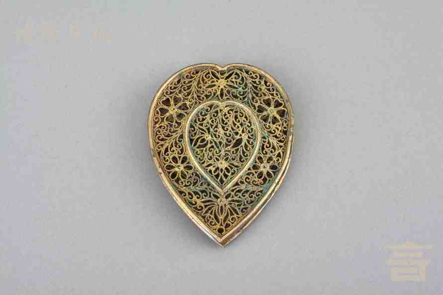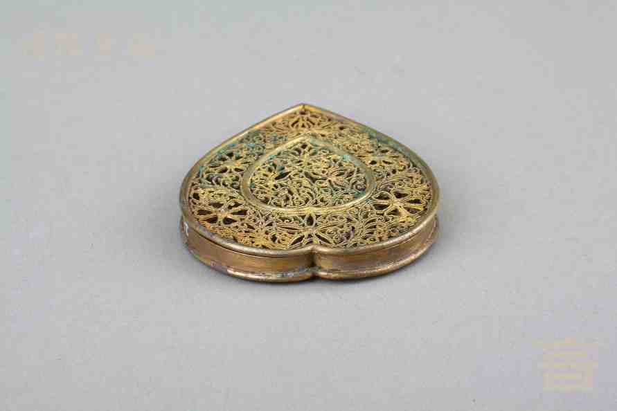 > 南宋银鎏金镂空心形香熏
