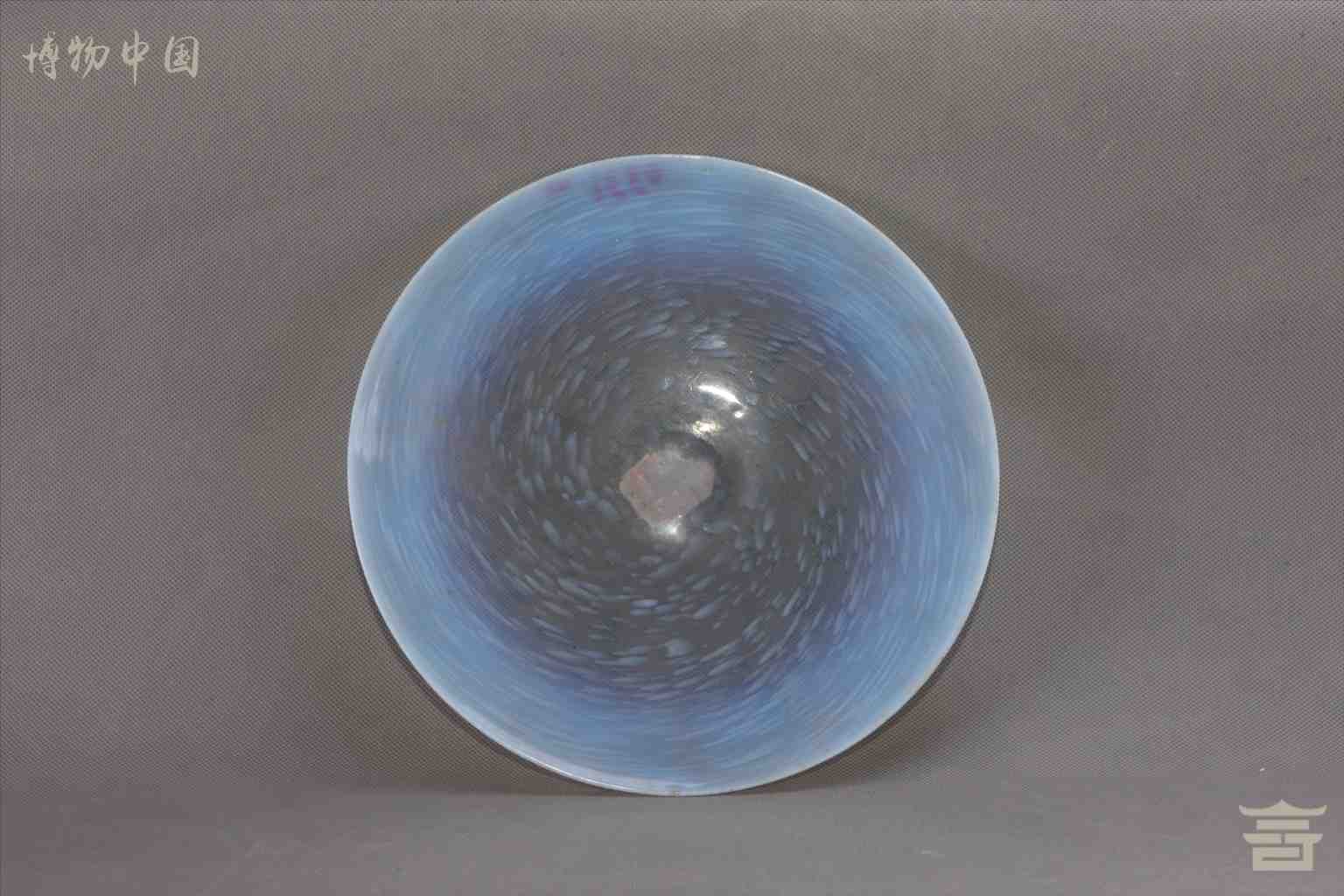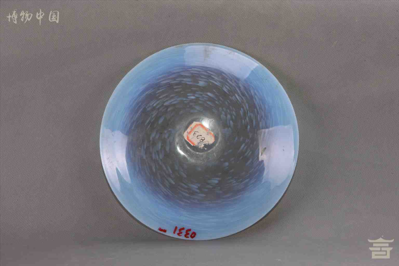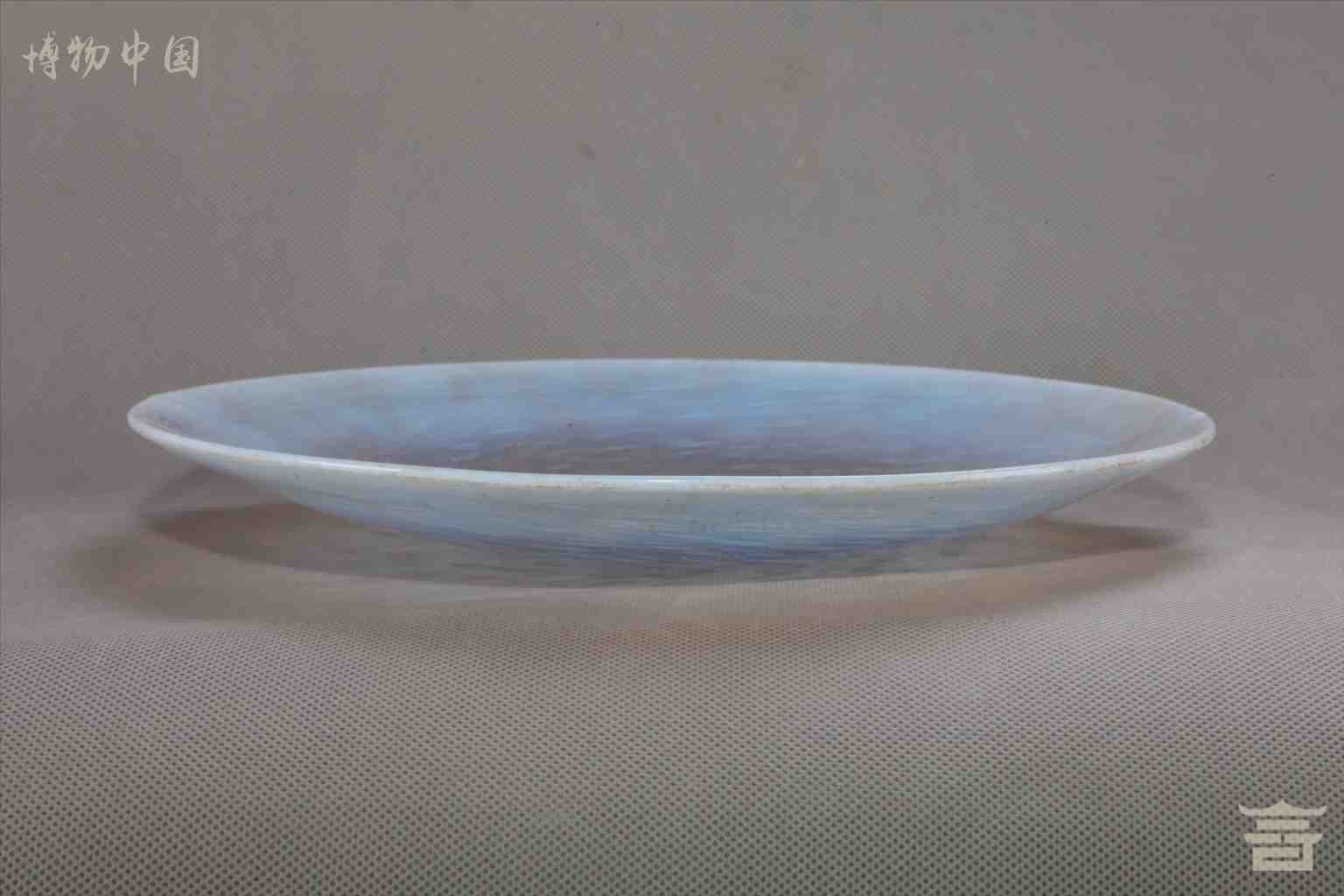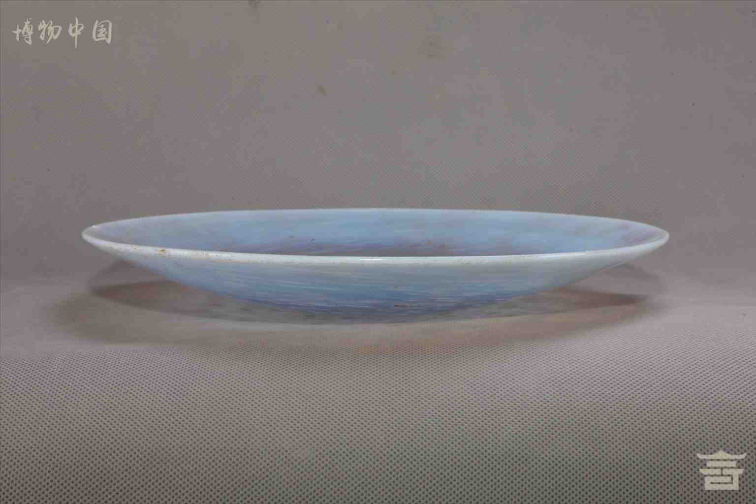 > 19世纪湖水蓝底白旋点花料卧足玻璃盘