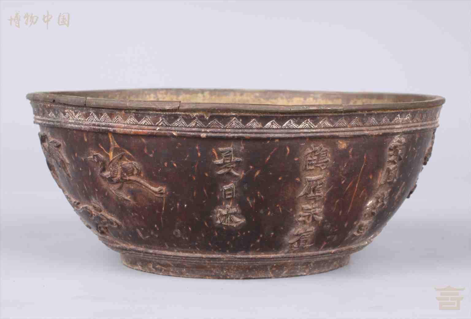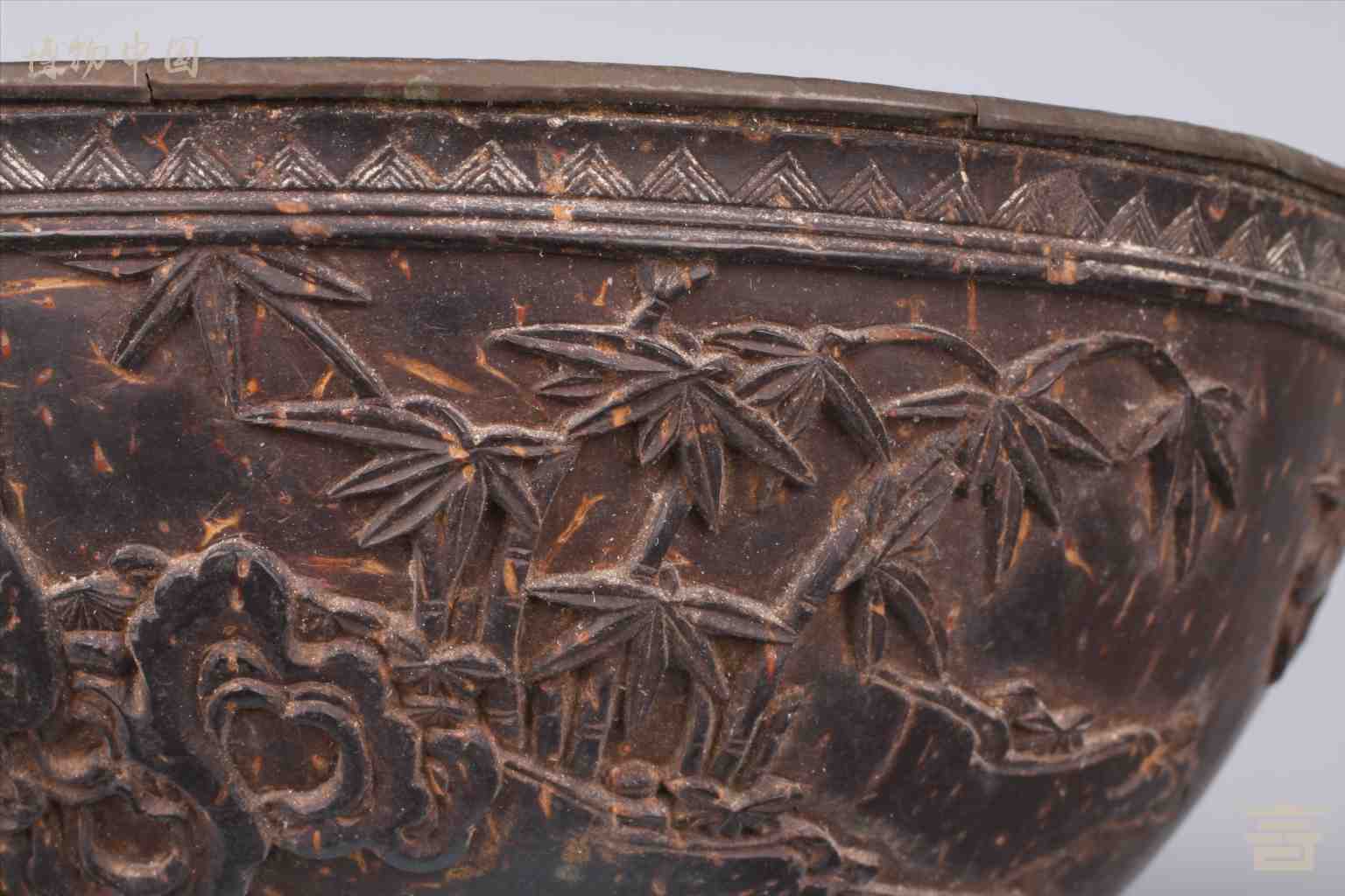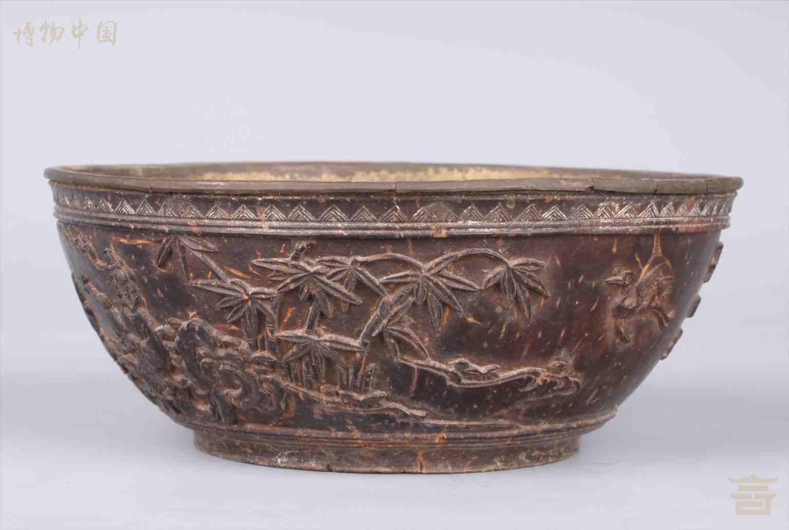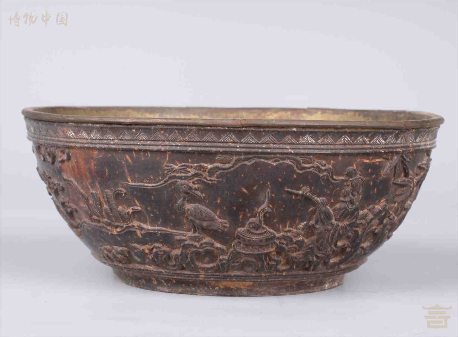 > 清雕仕女仙鹤纹套锡椰壳碗