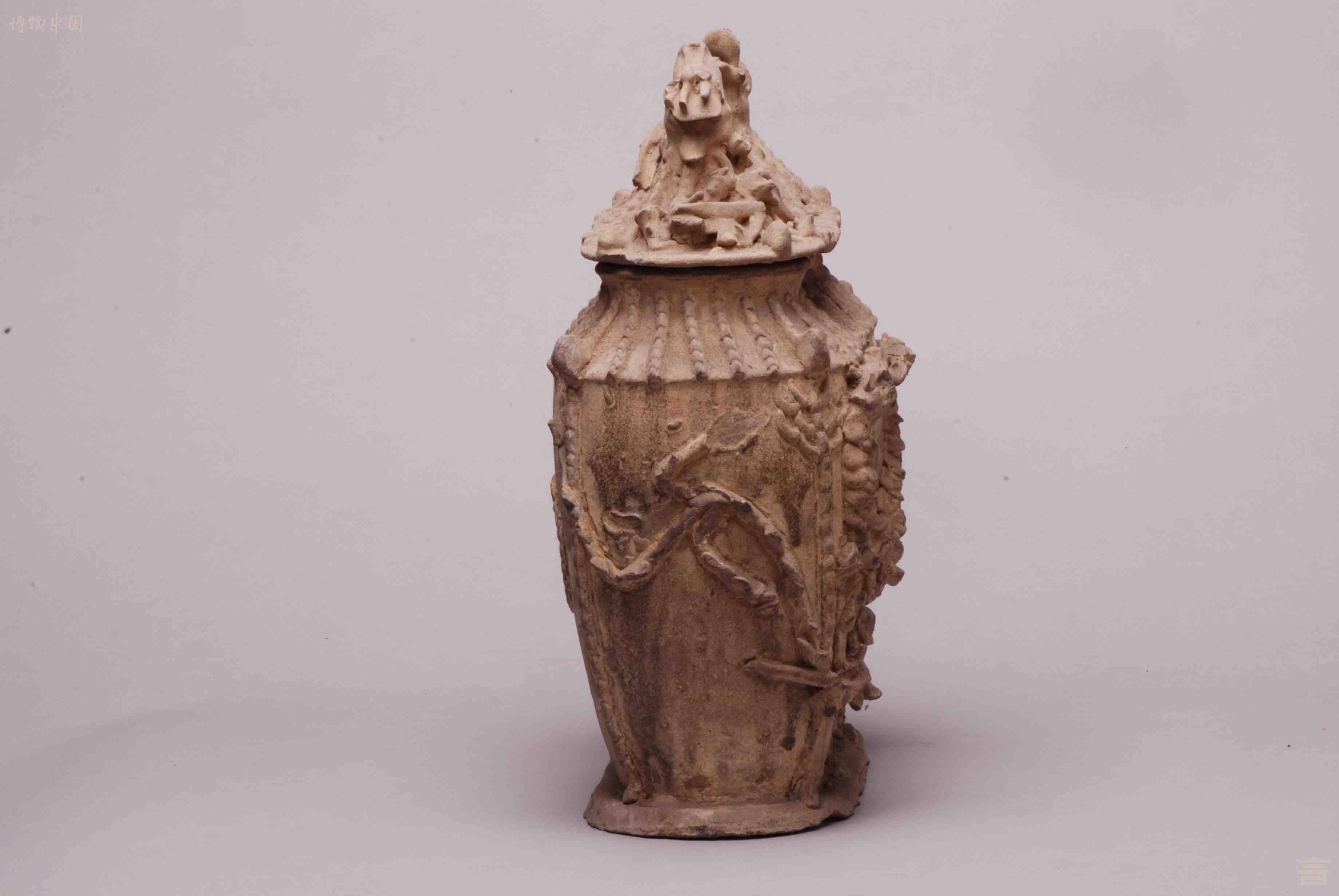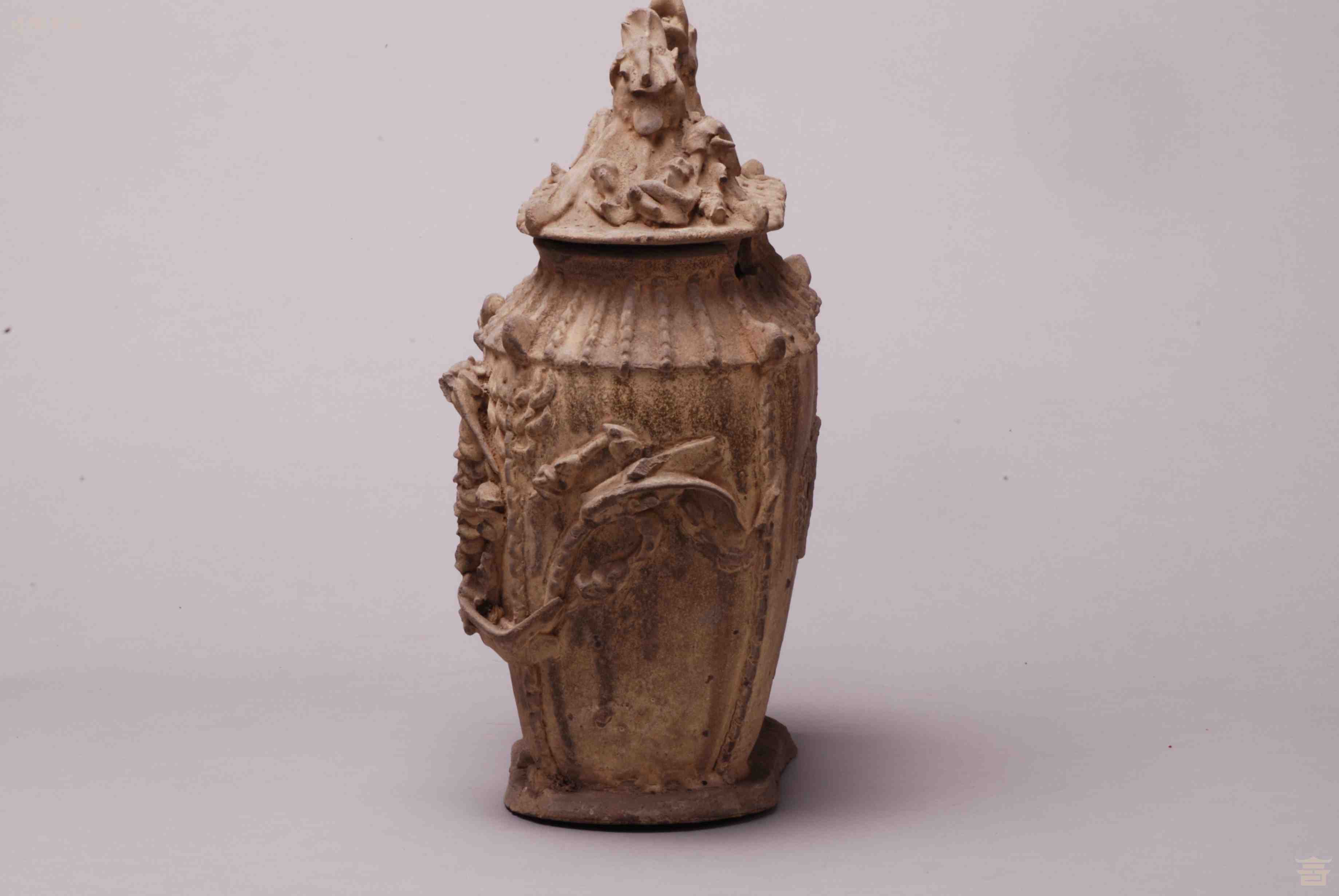> 明代宏志五年黄釉堆塑龙纹屋顶盖连体陶谷仓罐