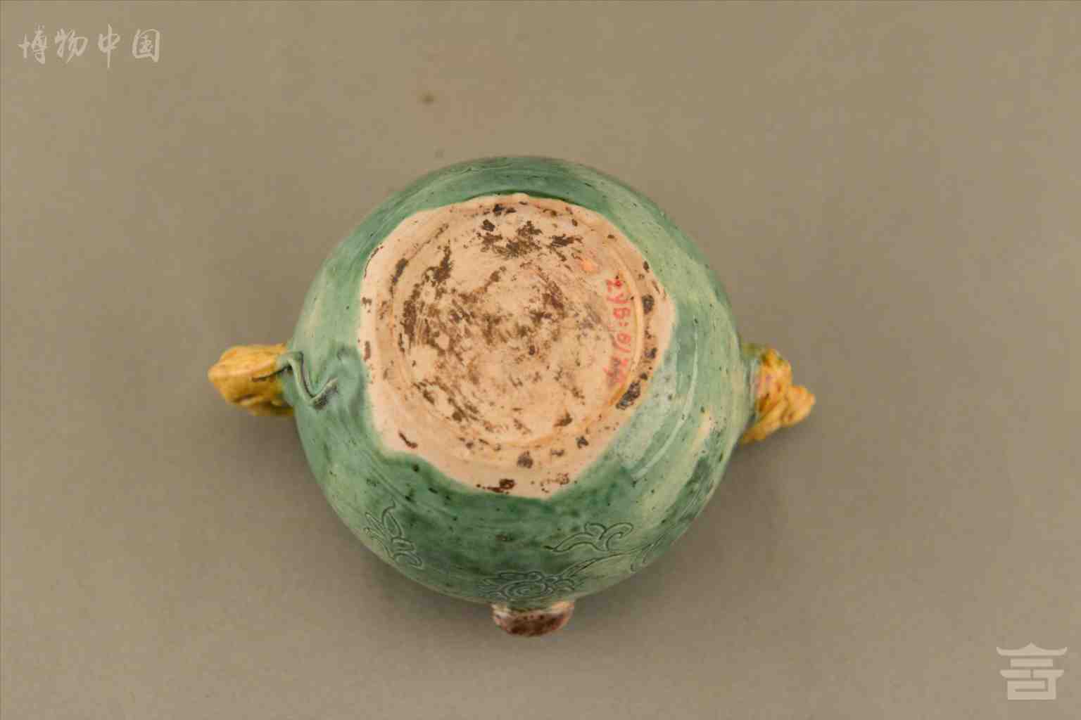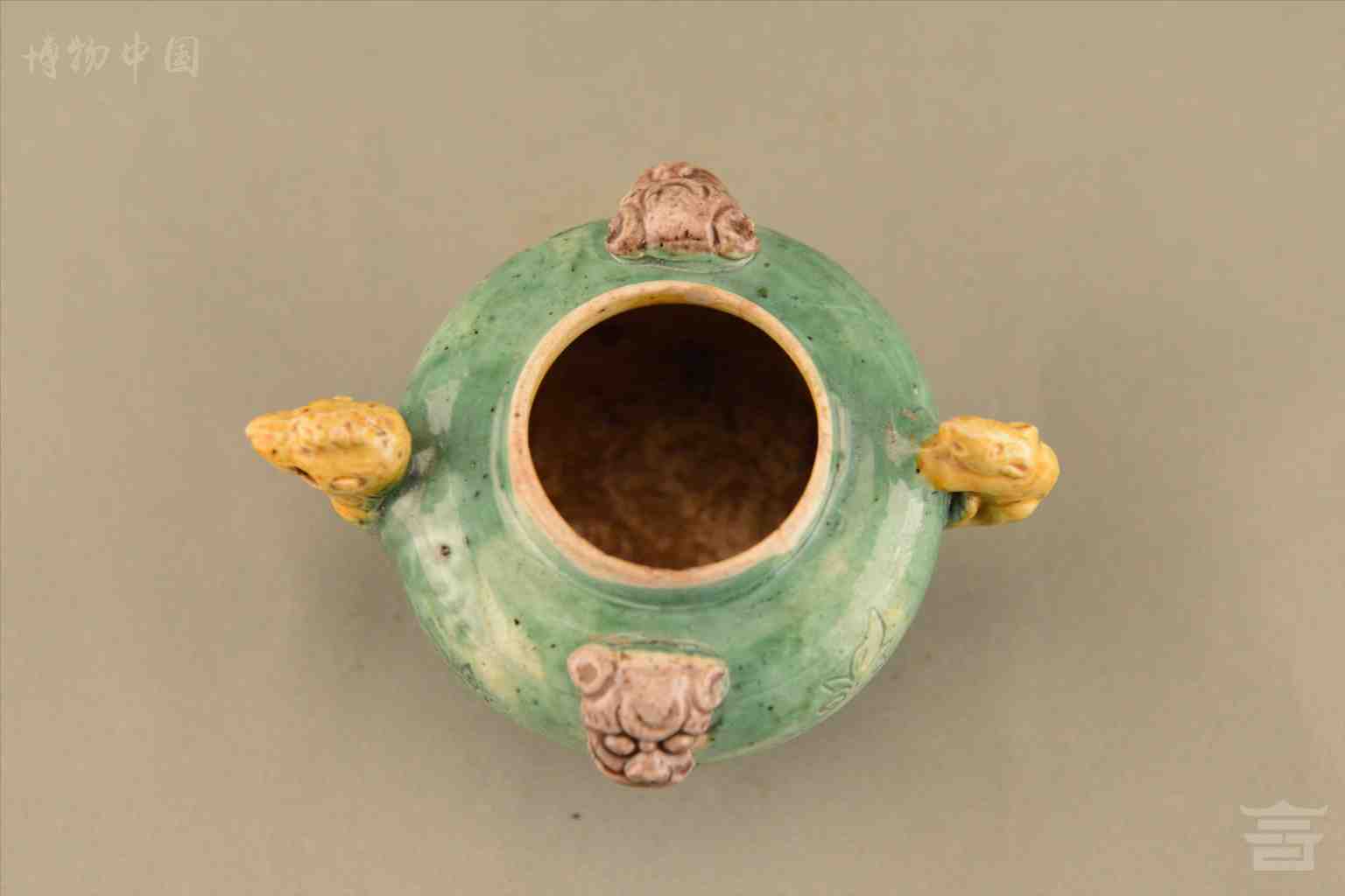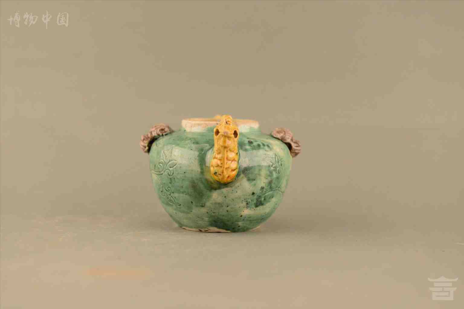 > 元代黄绿釉划花牡丹纹鸡首鼠尾瓷执壶