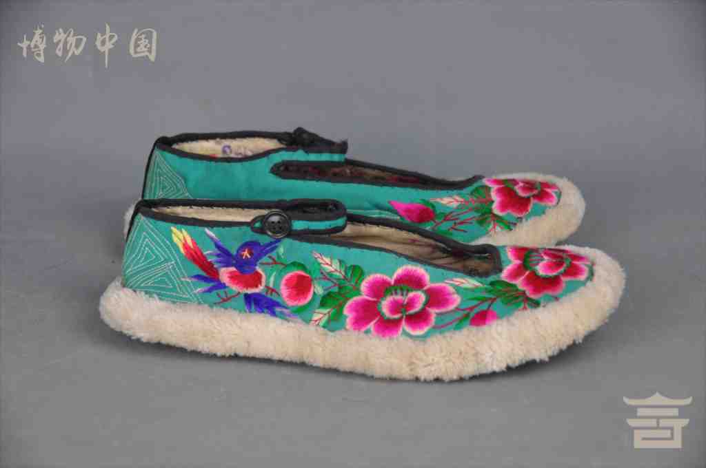 > 当代南涧彝族粉绿地牡丹花纹毛边底绣鞋