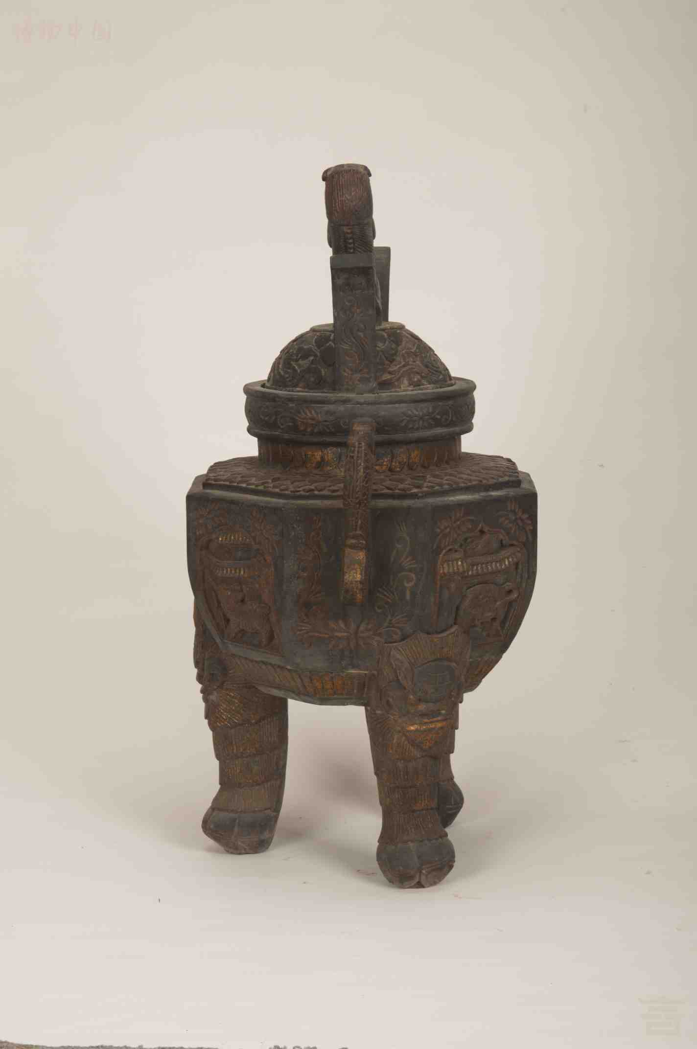清雕刻瑞兽纹六方鼎式樟木香炉