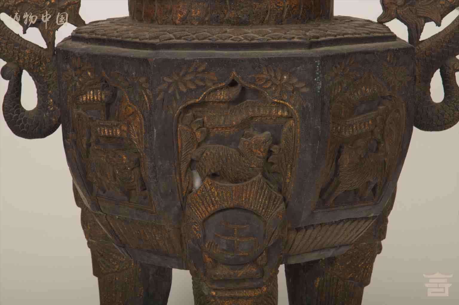 > 清雕刻瑞兽纹六方鼎式樟木香炉