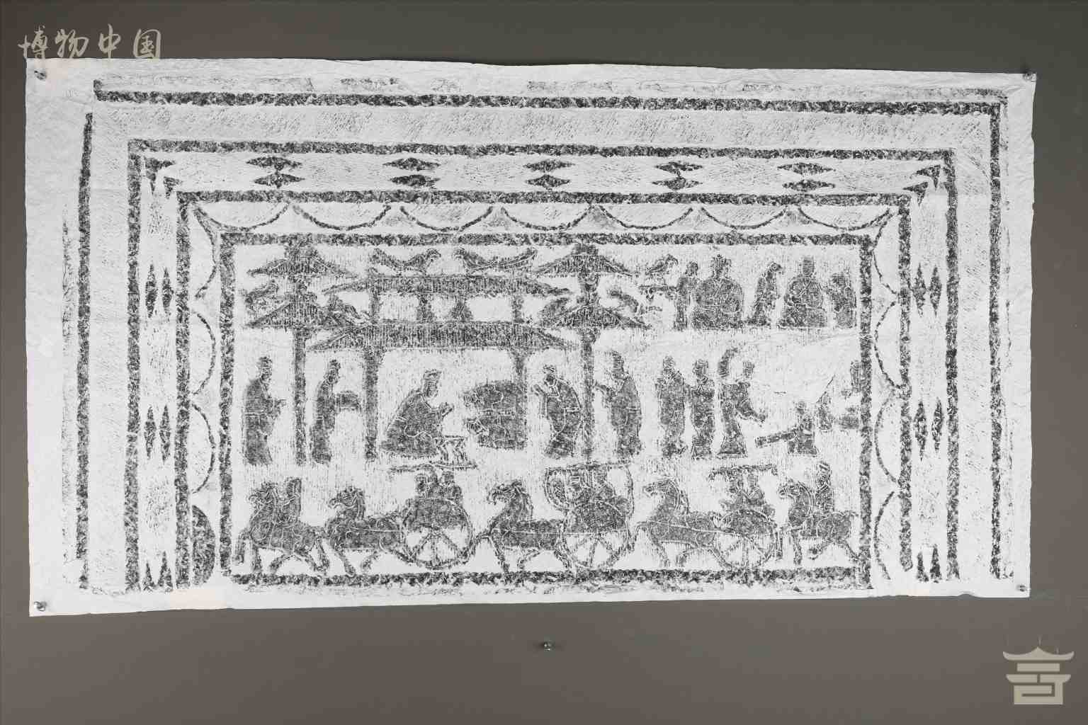 > 汉凿纹地凹面线刻楼阙人物车马出行画像石