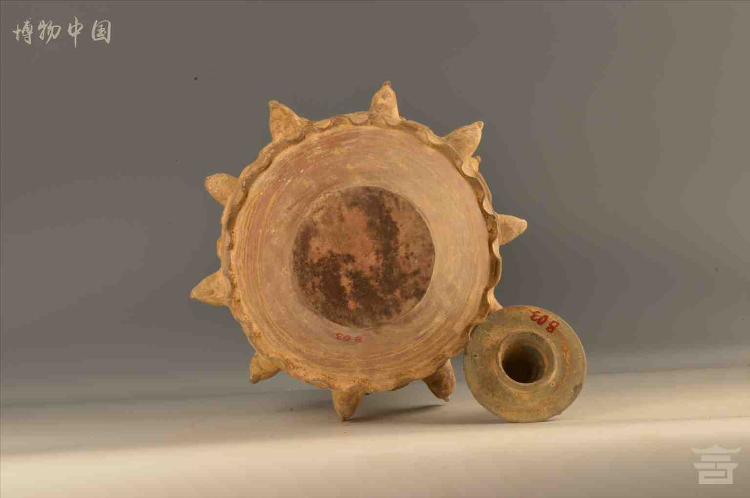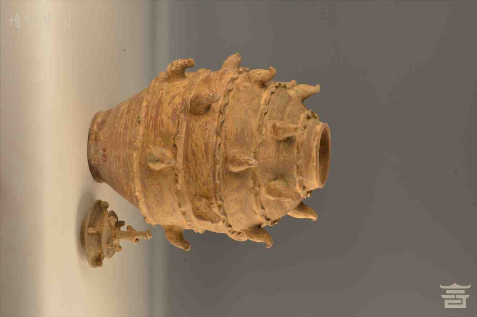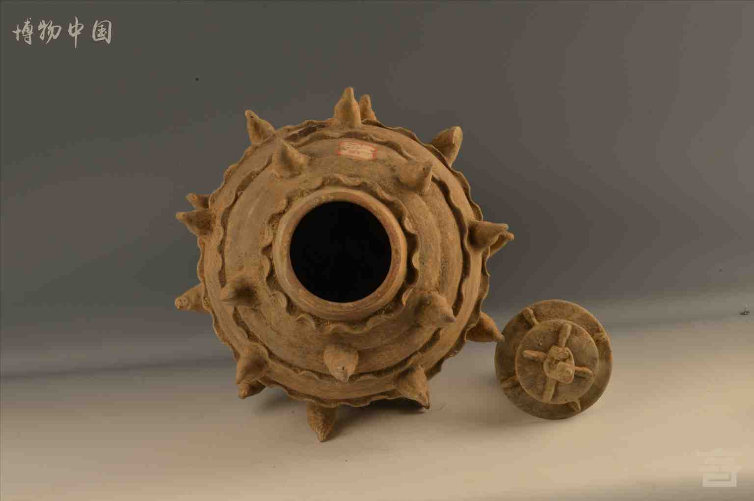 > 宋人物钮盖堆塑荷叶边多角陶魂瓶