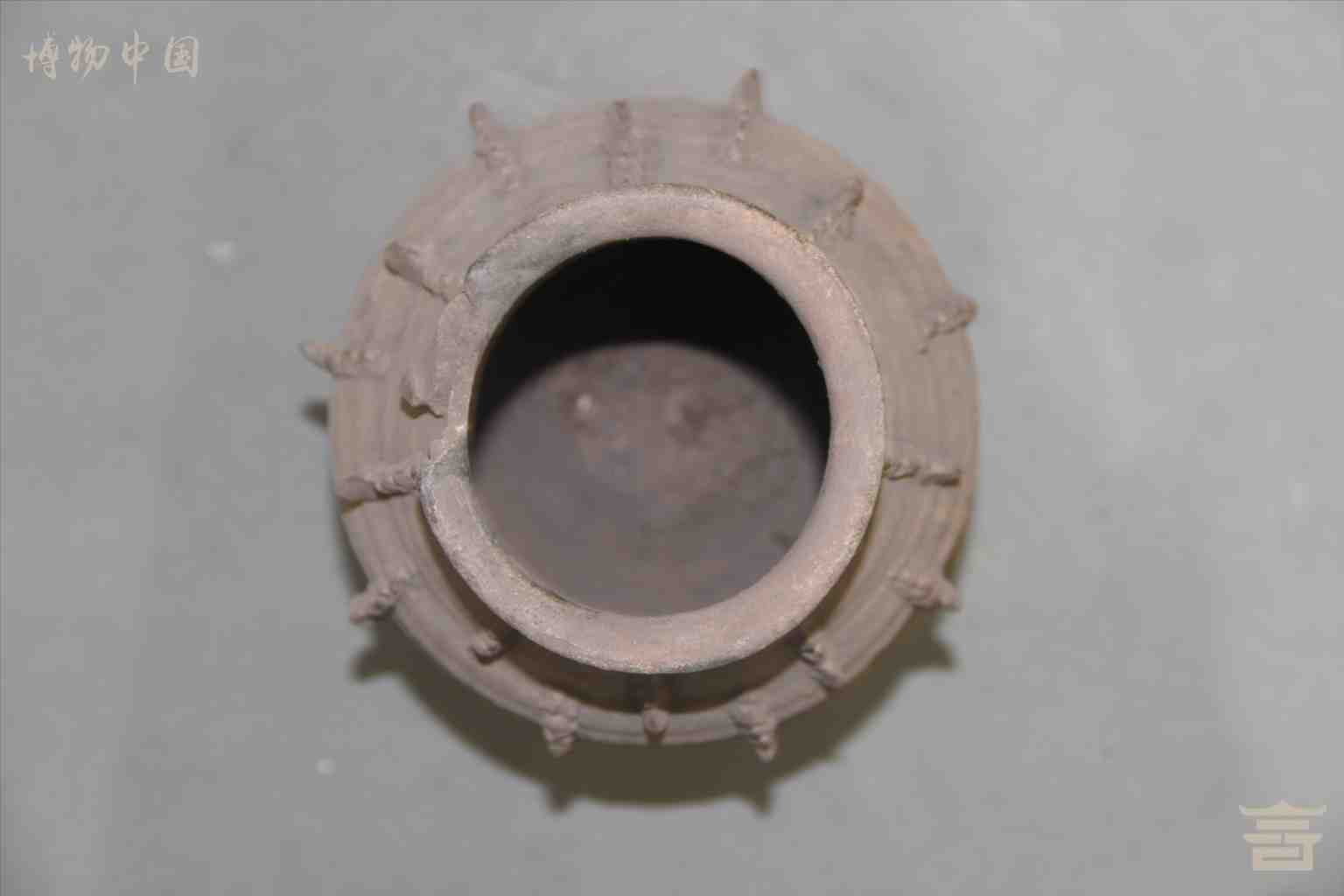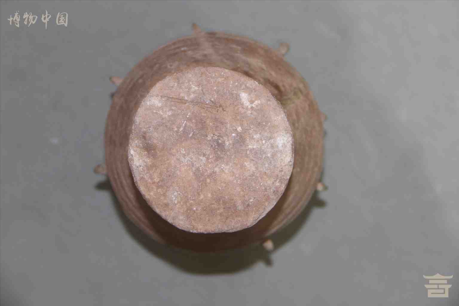 > 明青釉贴塑瓦楞纹陶谷仓罐