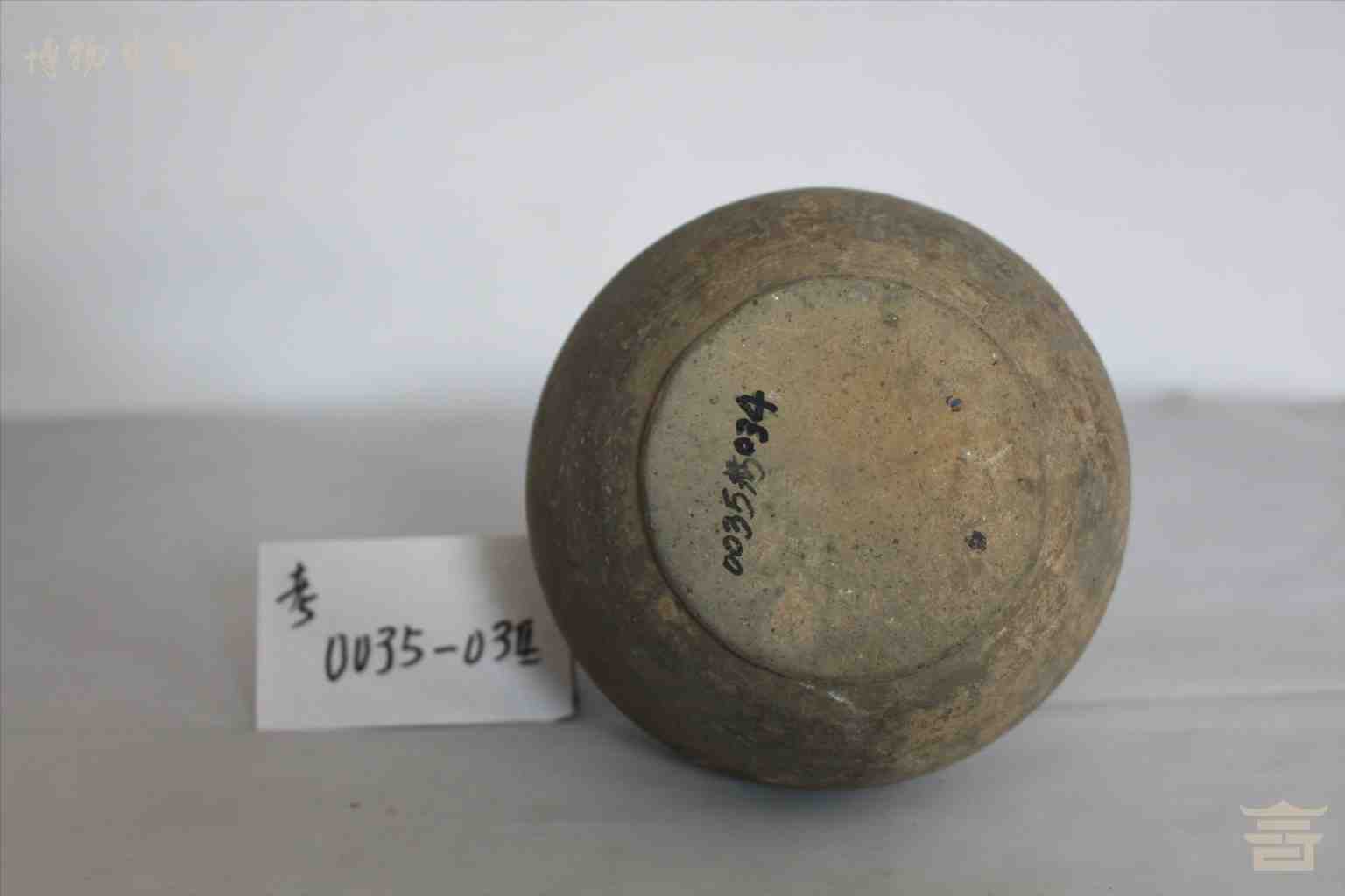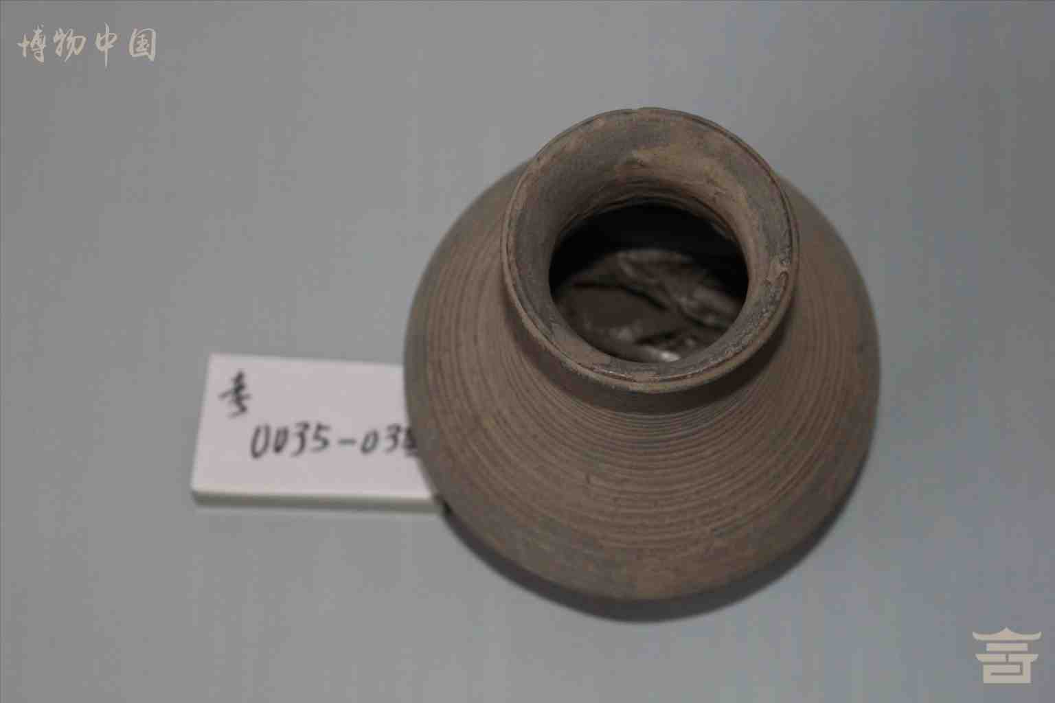 > 东汉灰陶弦纹长颈壶