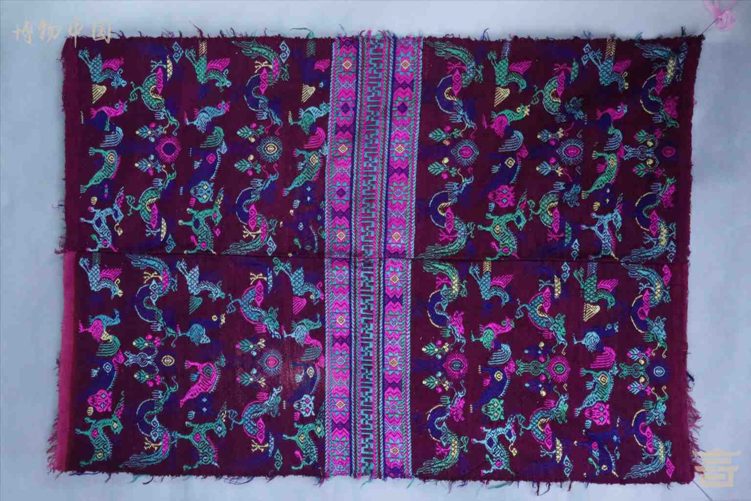 > 民国毛南族深红底“龙凤”纹饰织锦被面