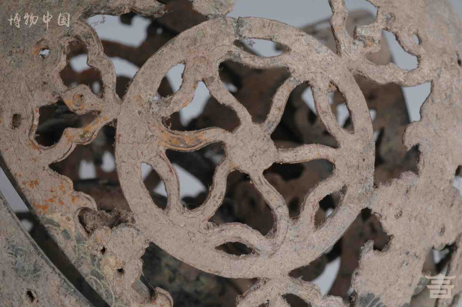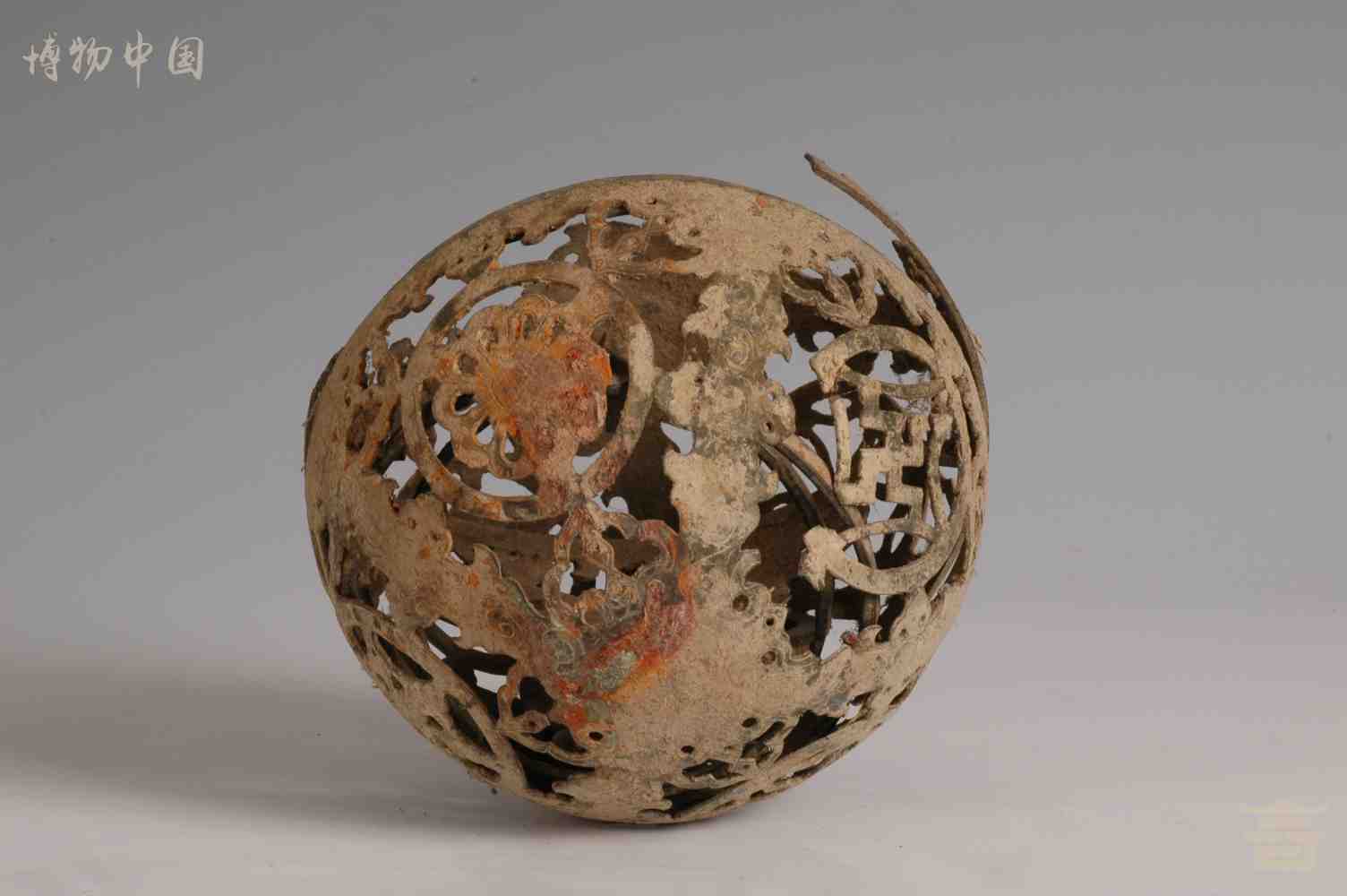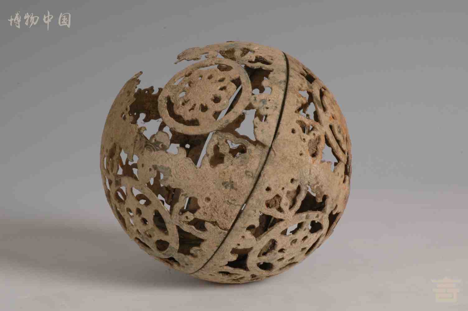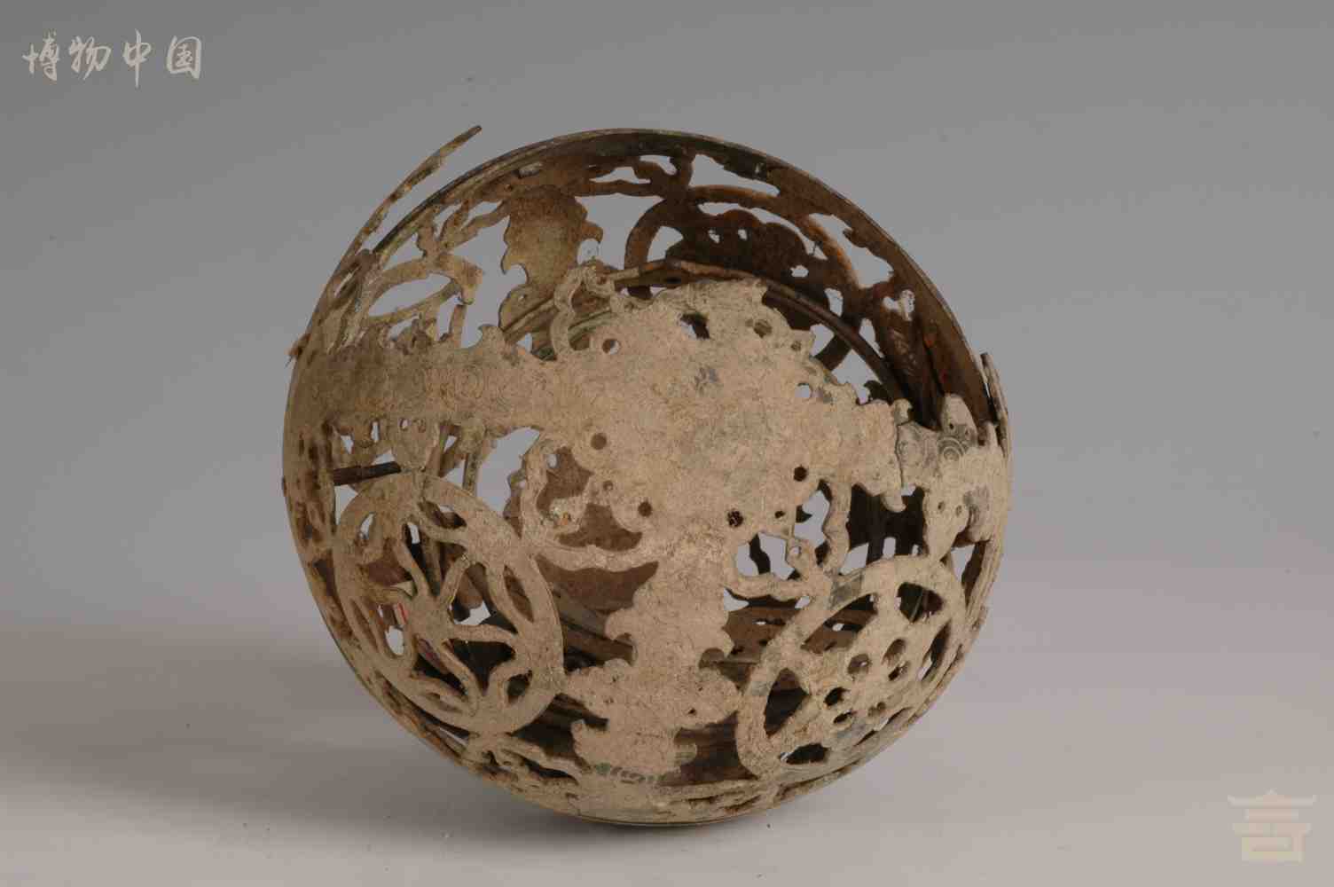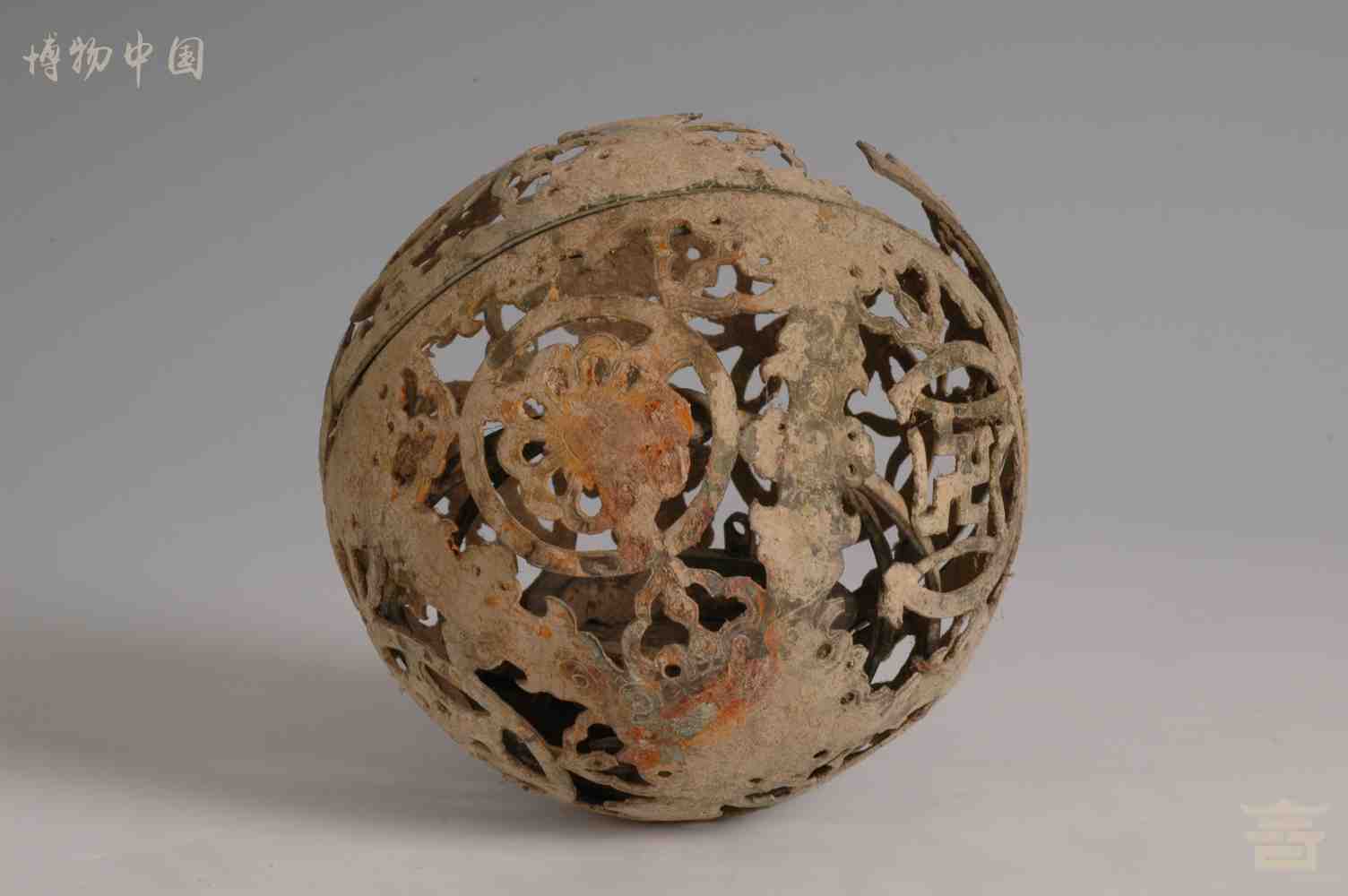 > 唐镂空团花纹铜熏球