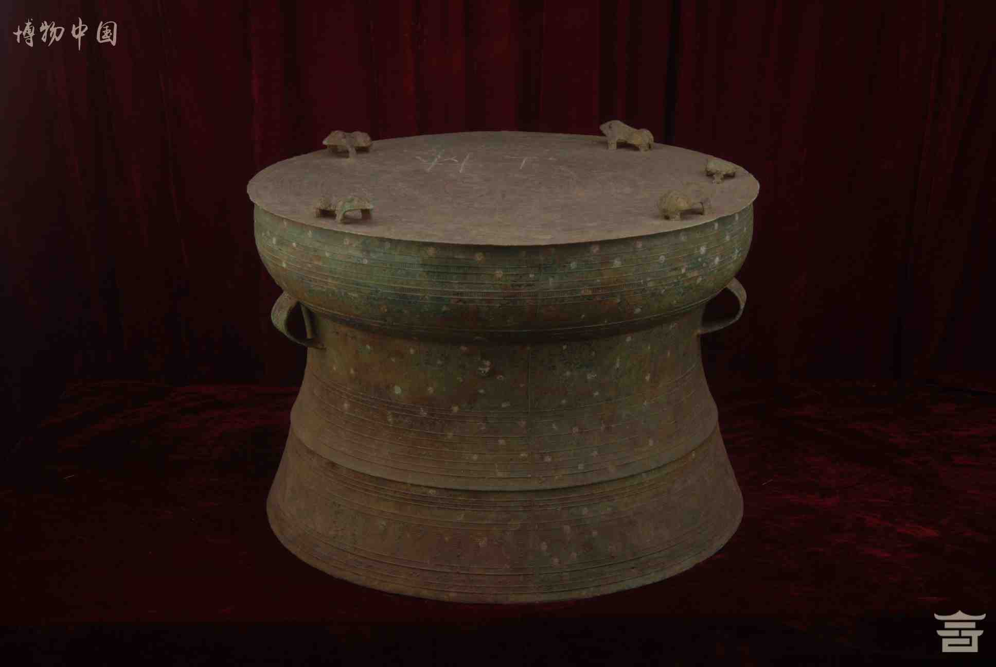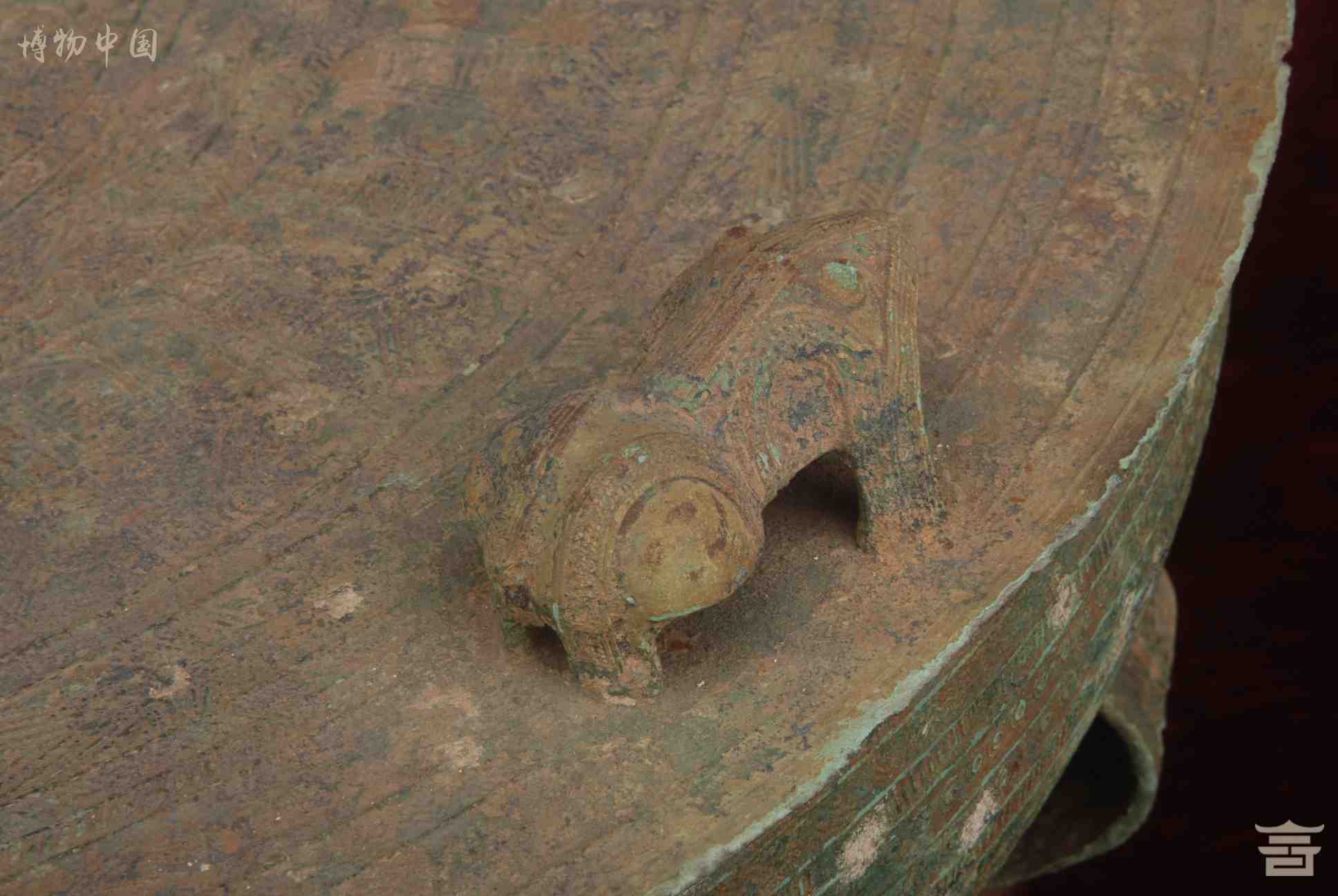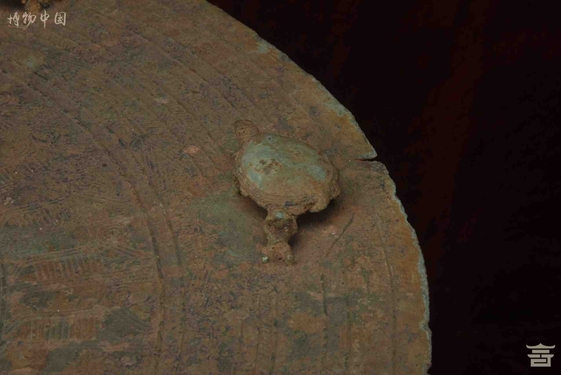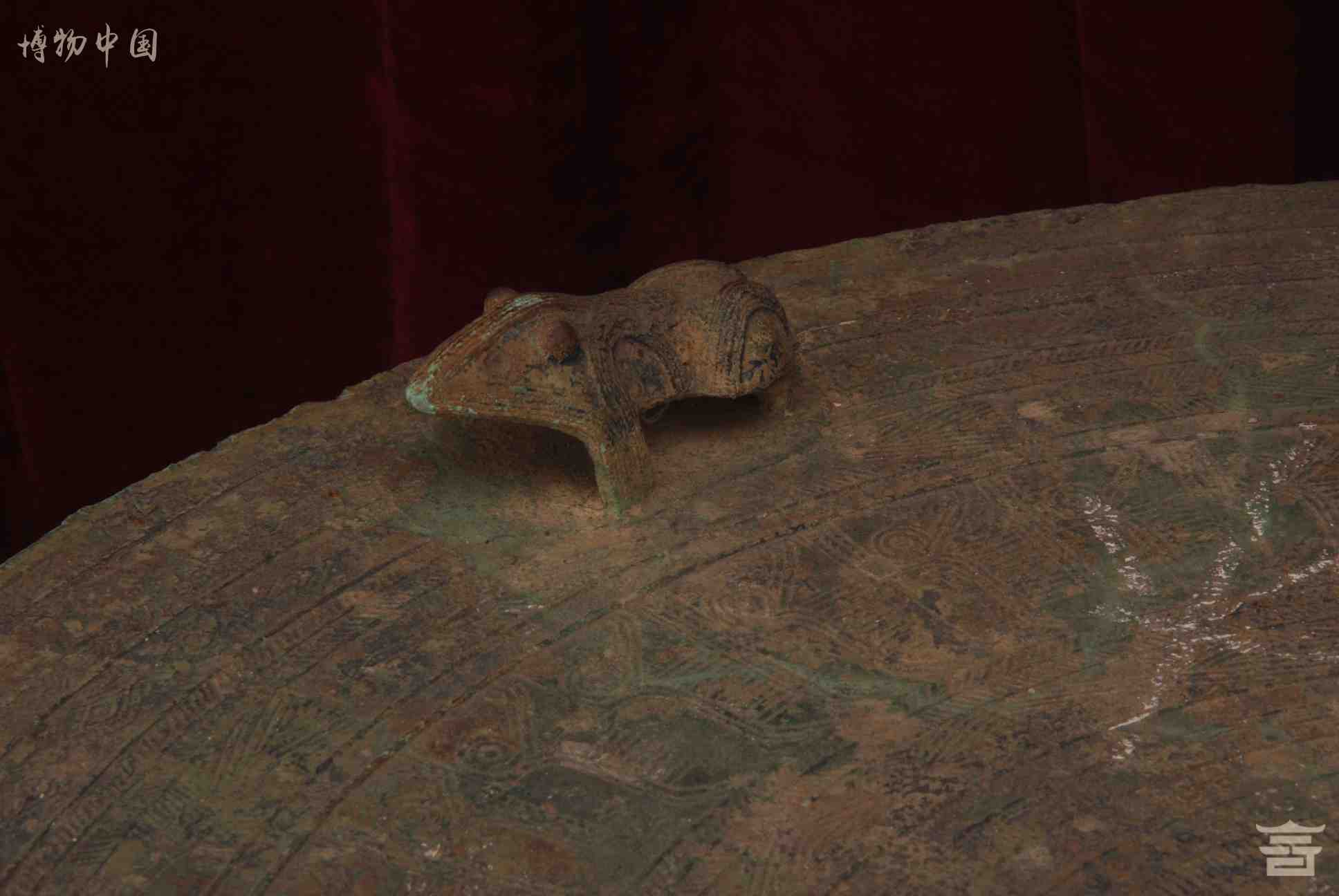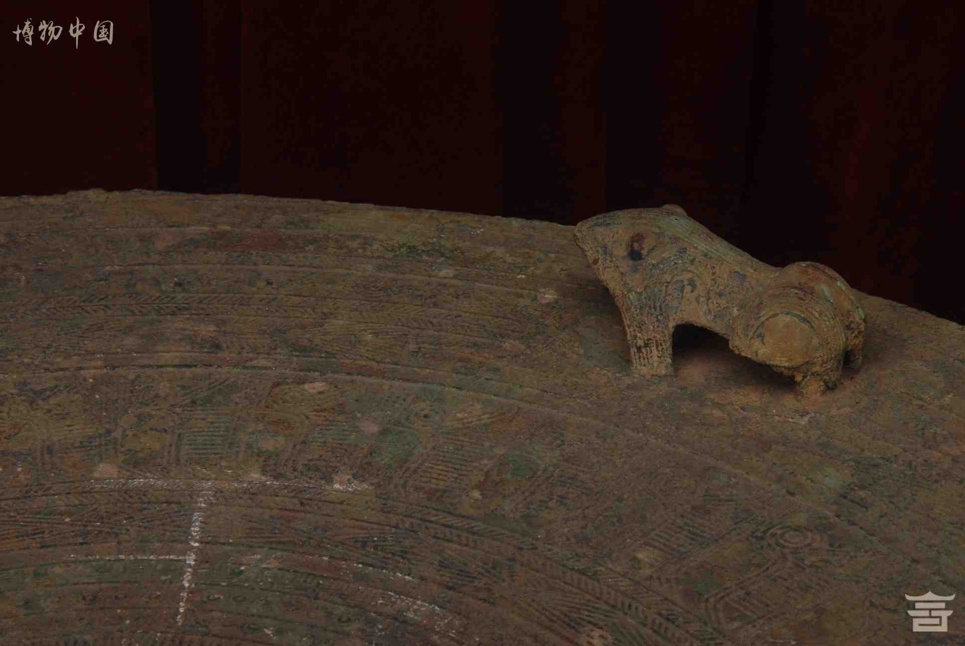 > 东汉四蛙间饰女童推龟羽人纹铜鼓