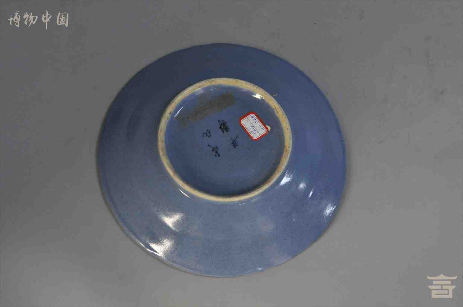 > 清仿明”成化年制“灰兰底青花寿字蝙蝠纹盘