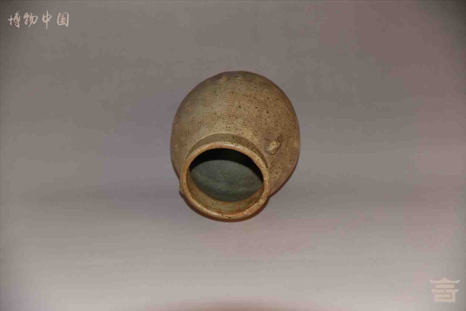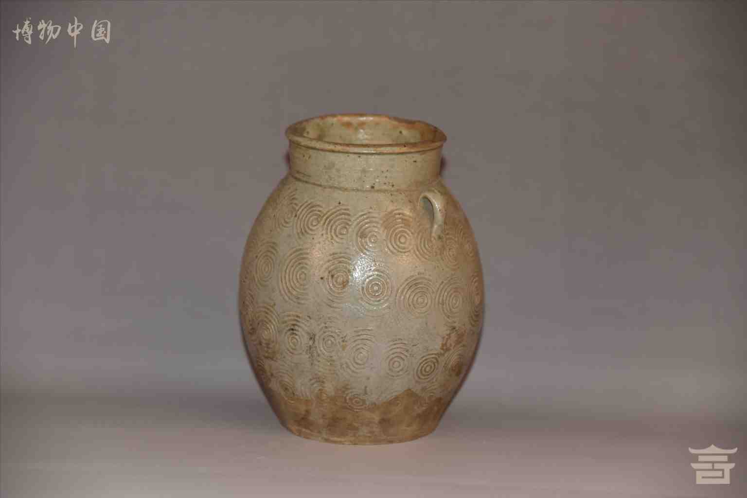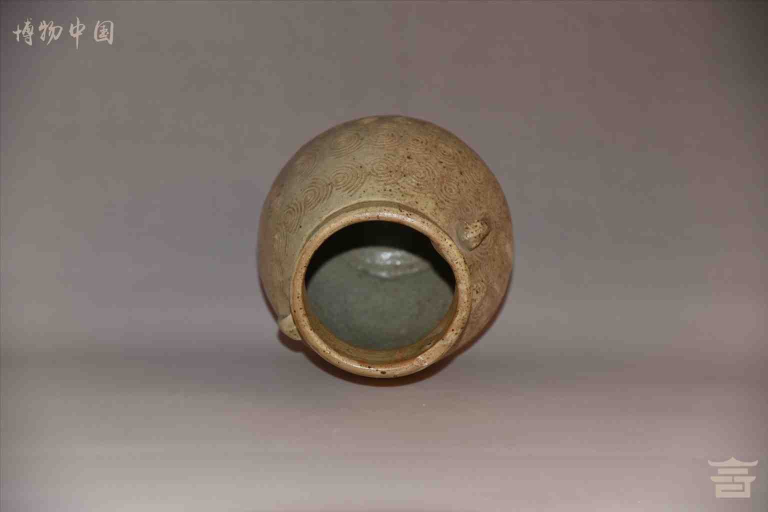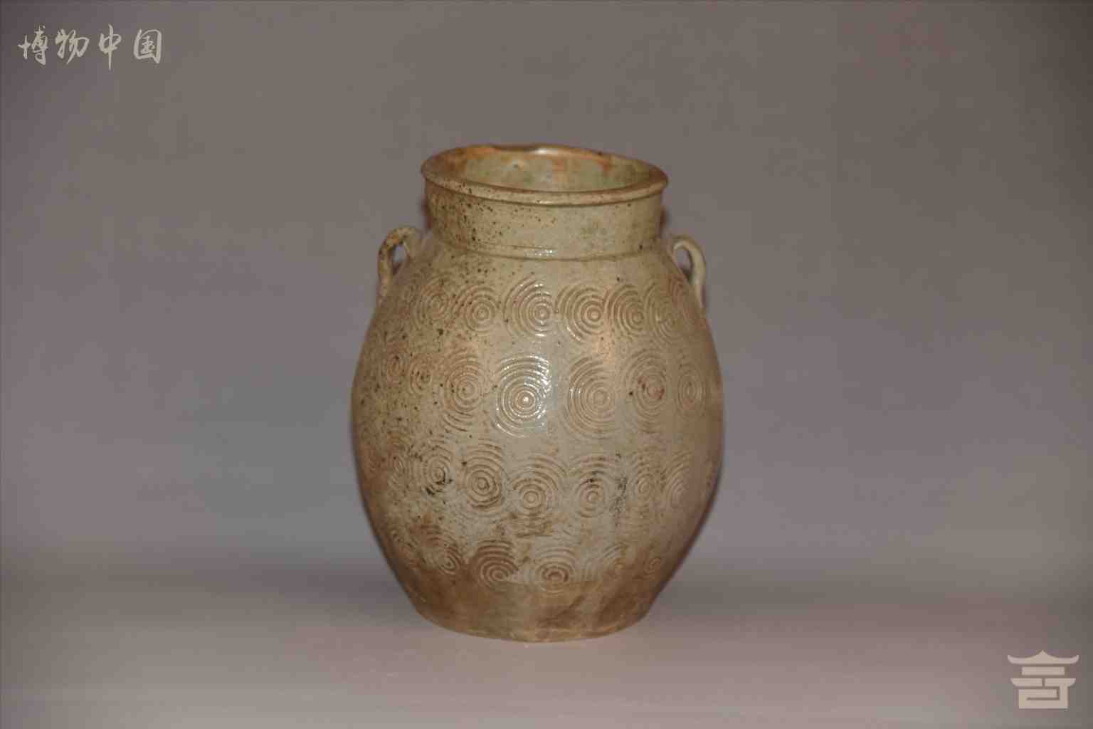 > 唐双耳鼓腹卷云纹青釉瓷罐