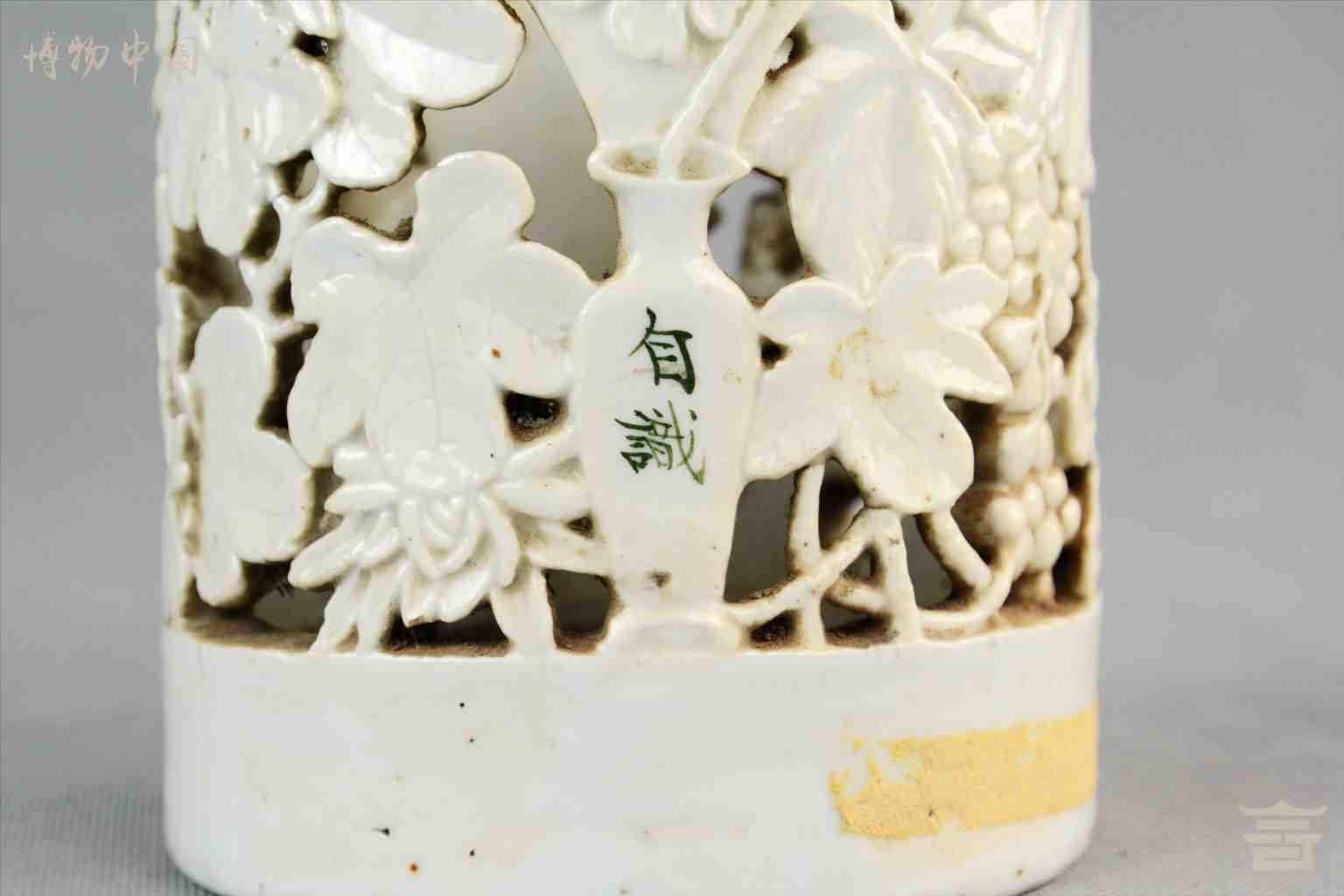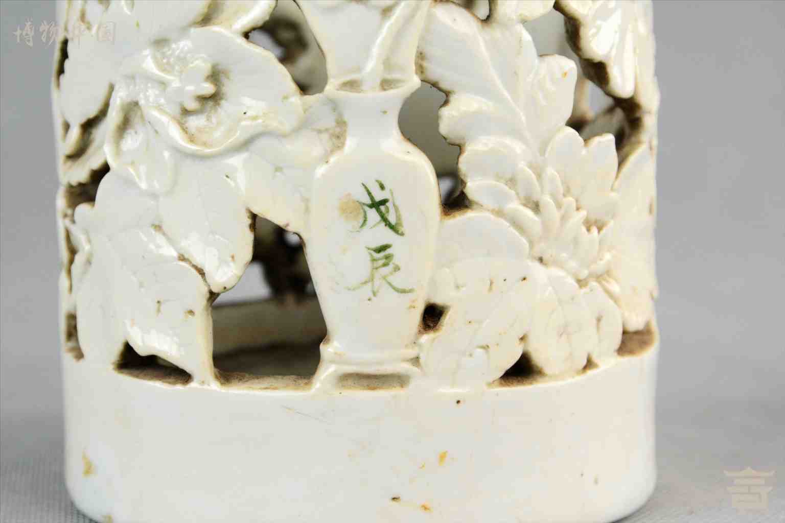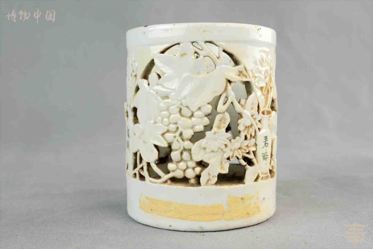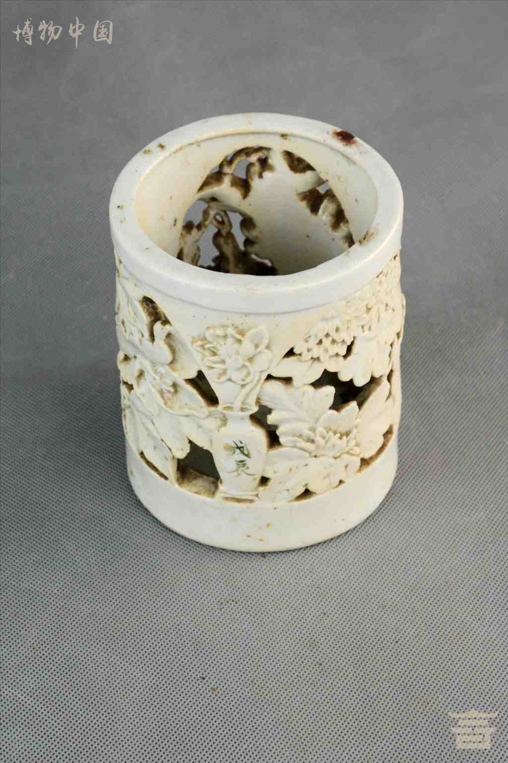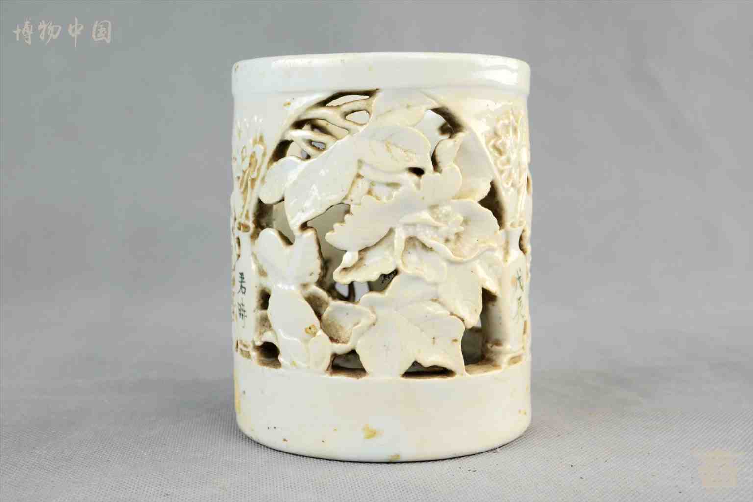 民国镂空花卉白瓷笔筒