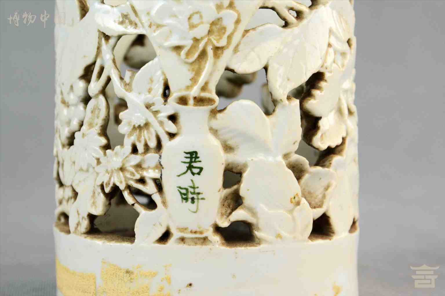 > 民国镂空花卉白瓷笔筒