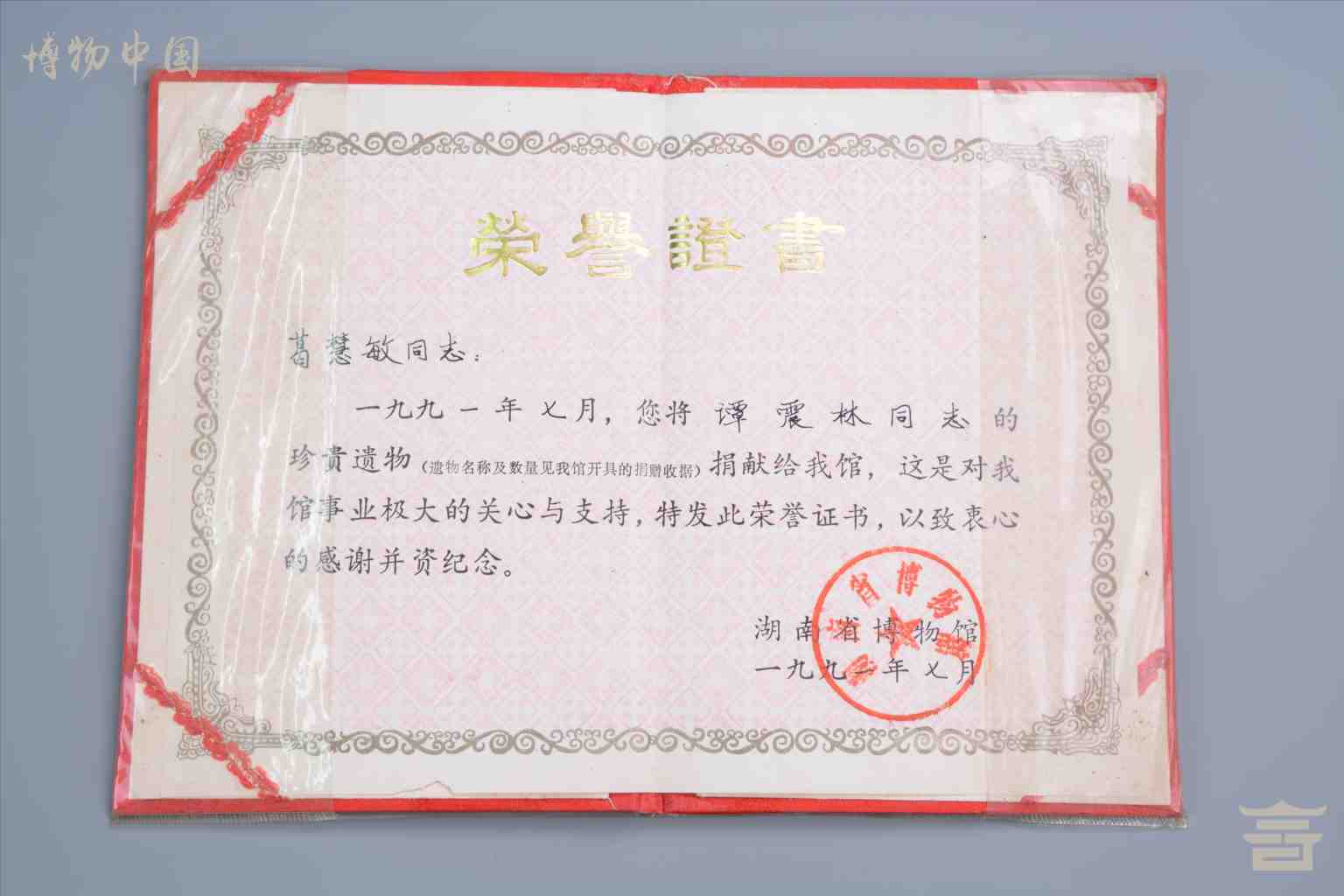 1991年葛慧敏捐赠谭震林遗物荣誉证书