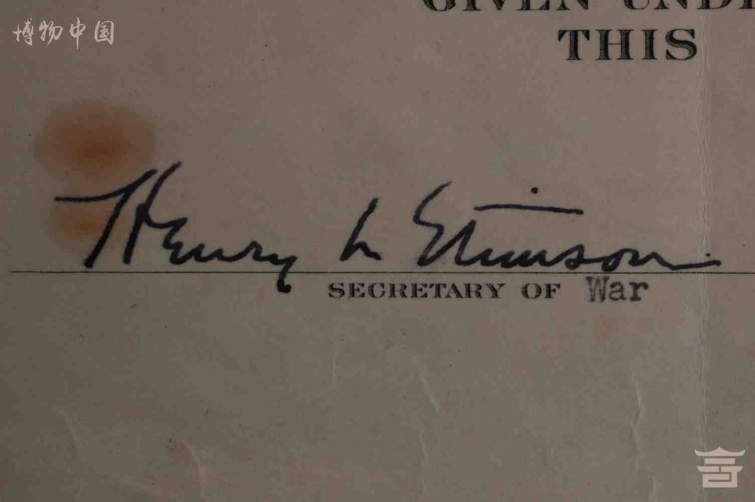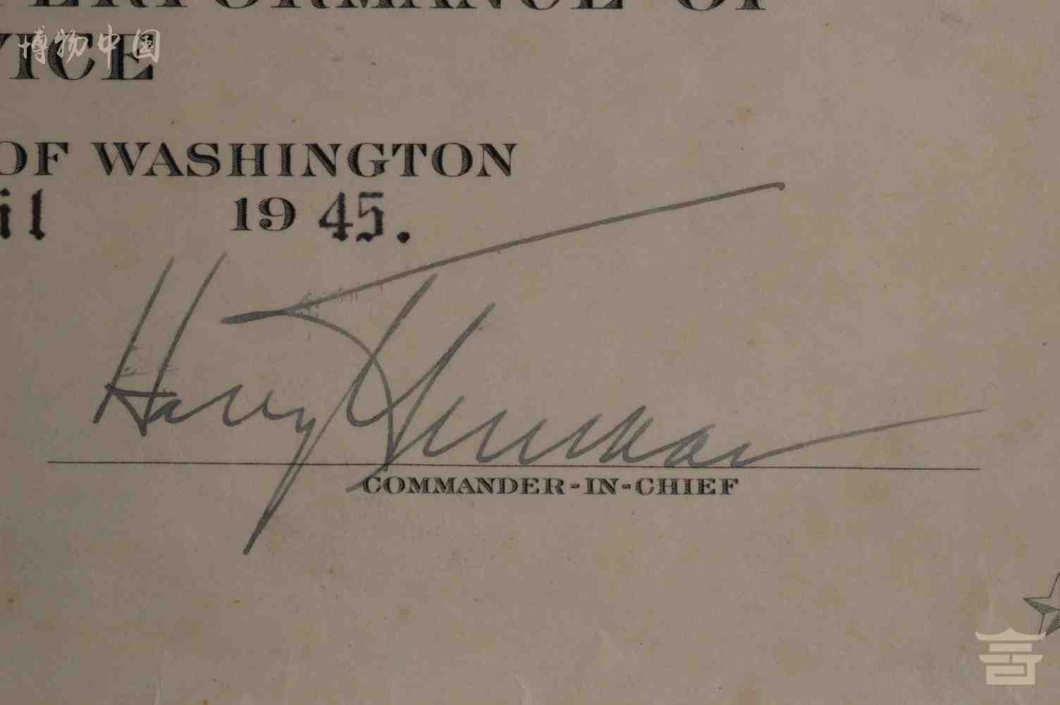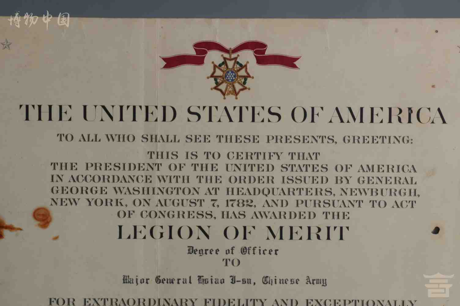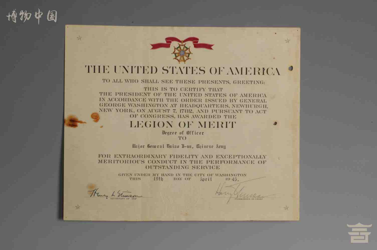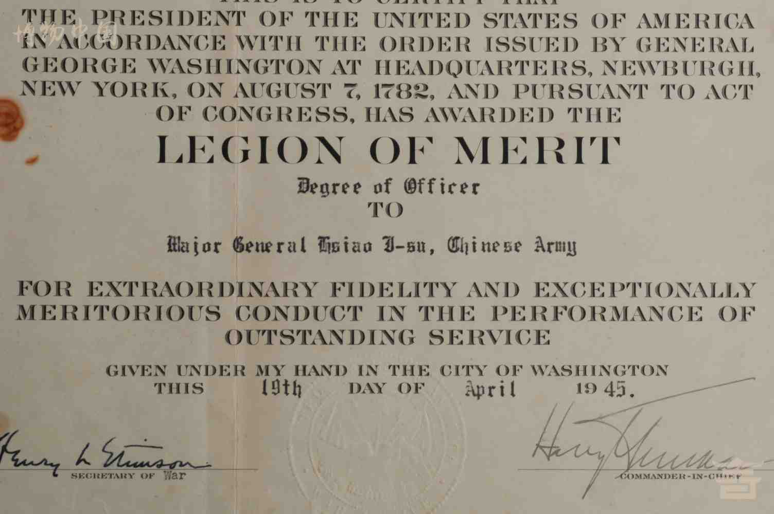 > 1945年杜鲁门和史汀生亲笔签名颁发给萧毅肃的美国陆军军官勋绩勋章及证书