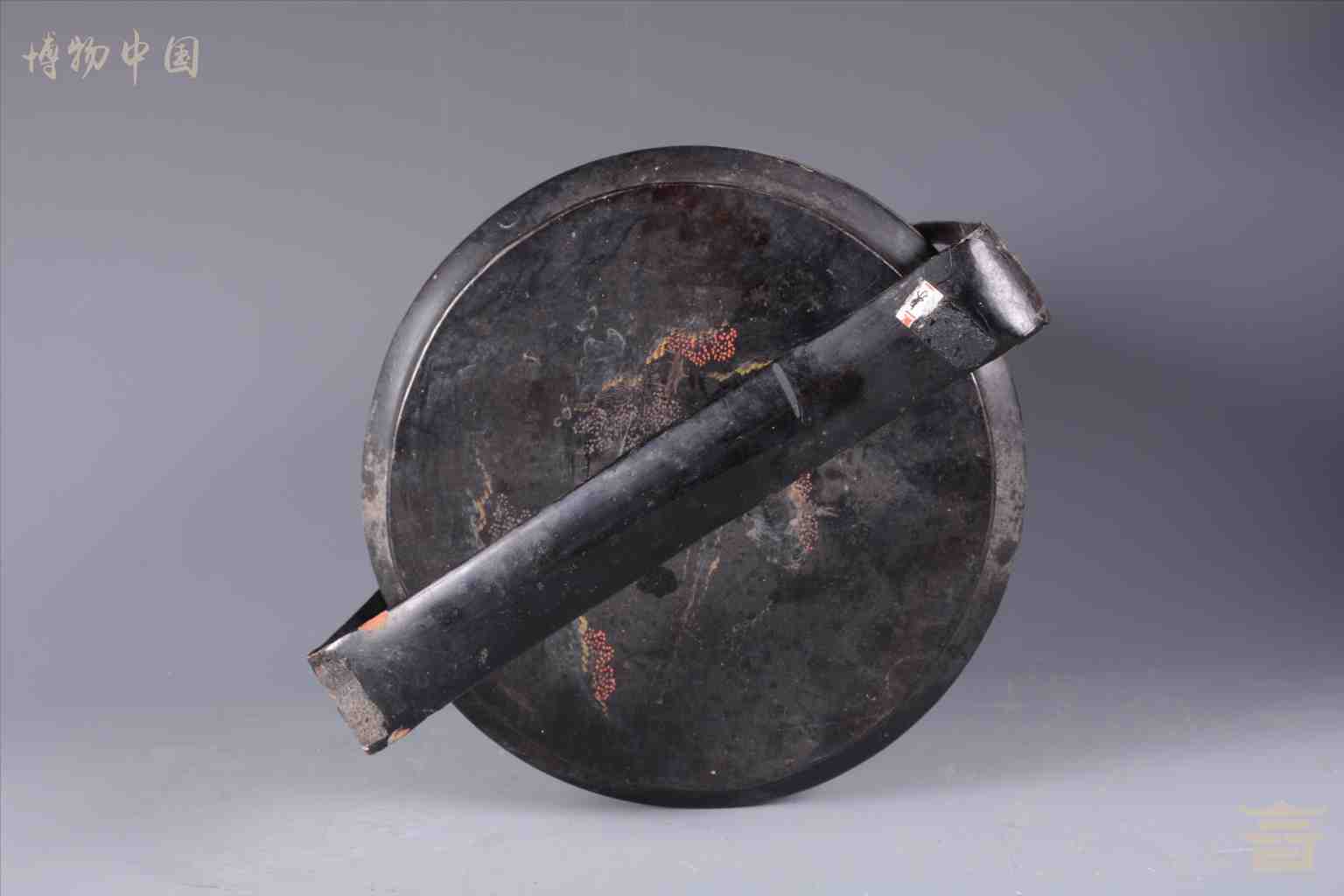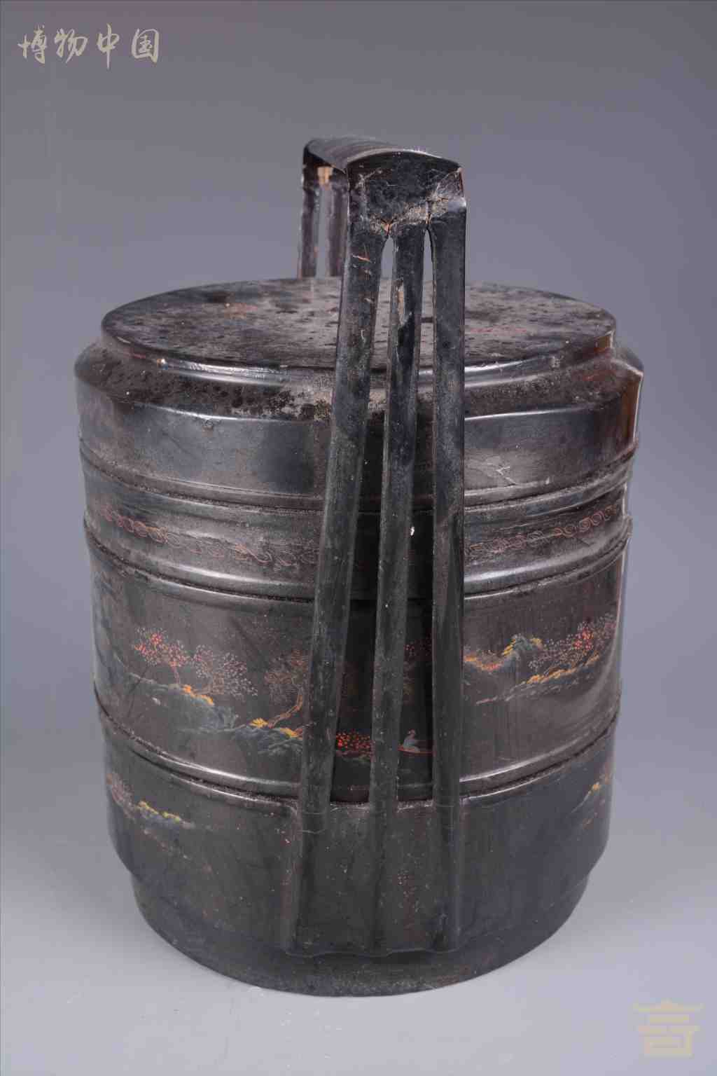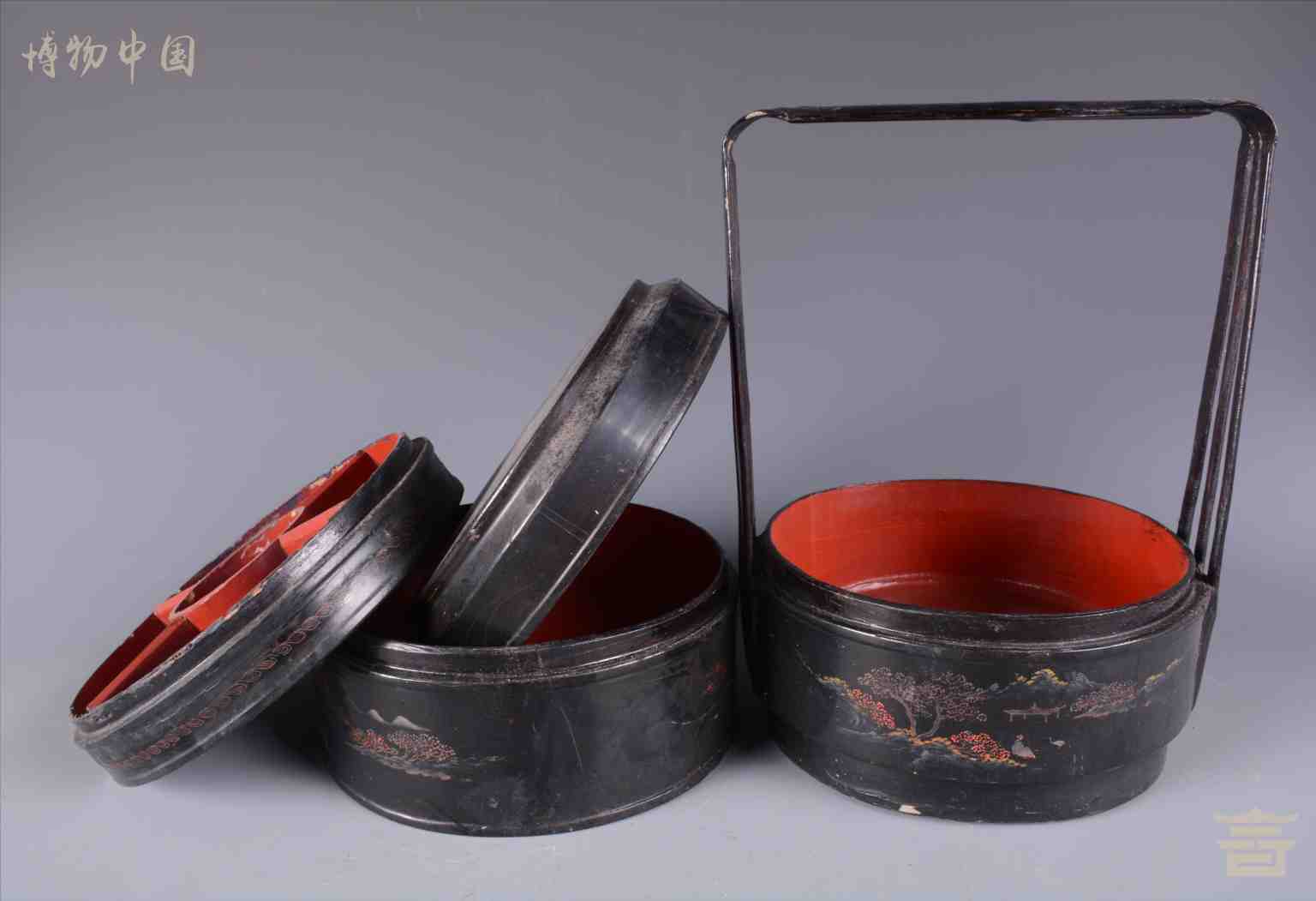 > 民国脱胎漆彩绘山水纹圆形多层木提盒