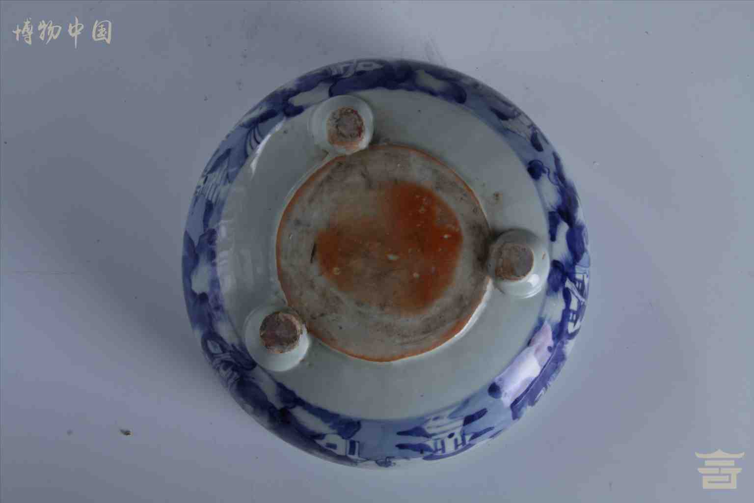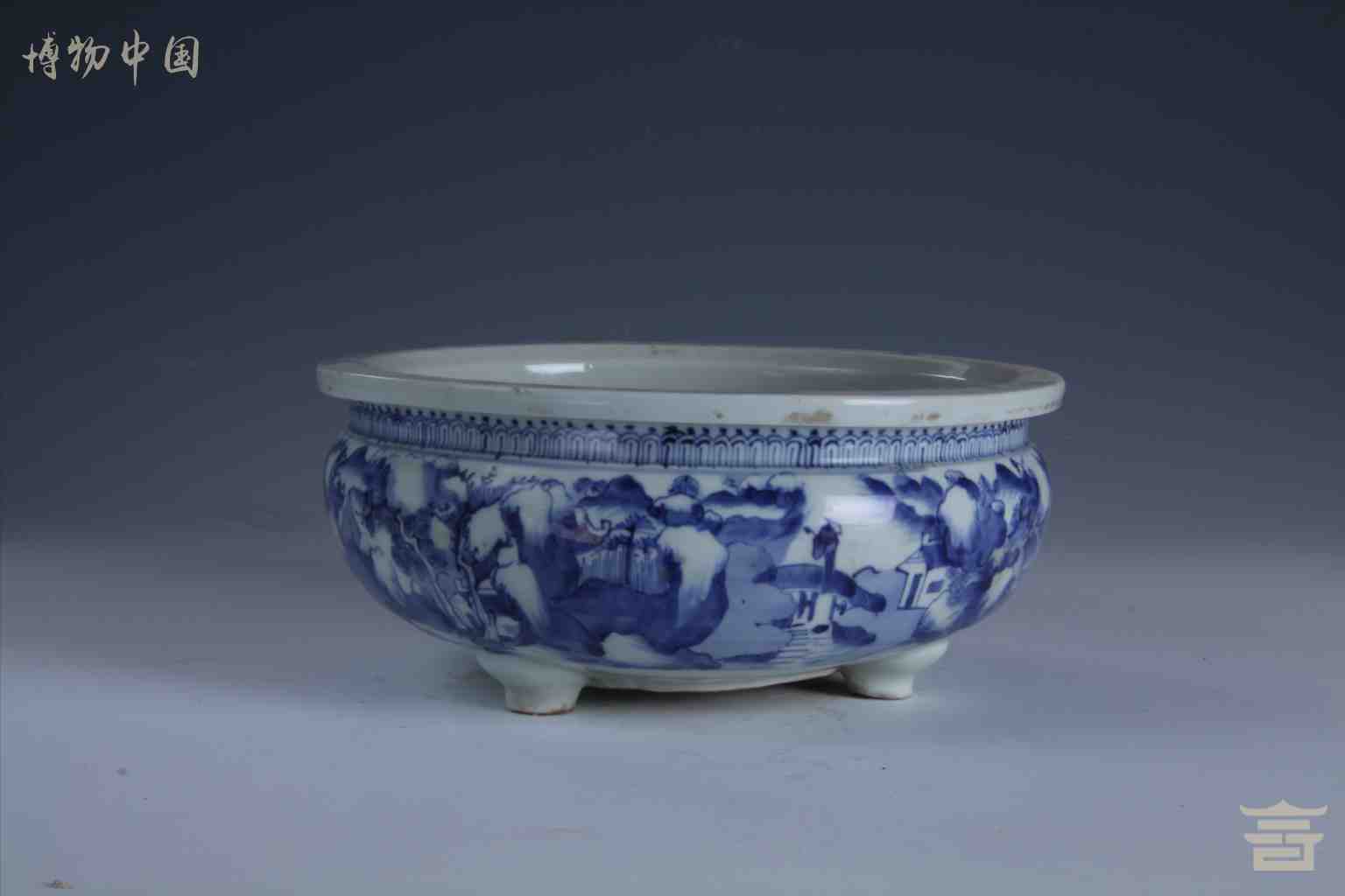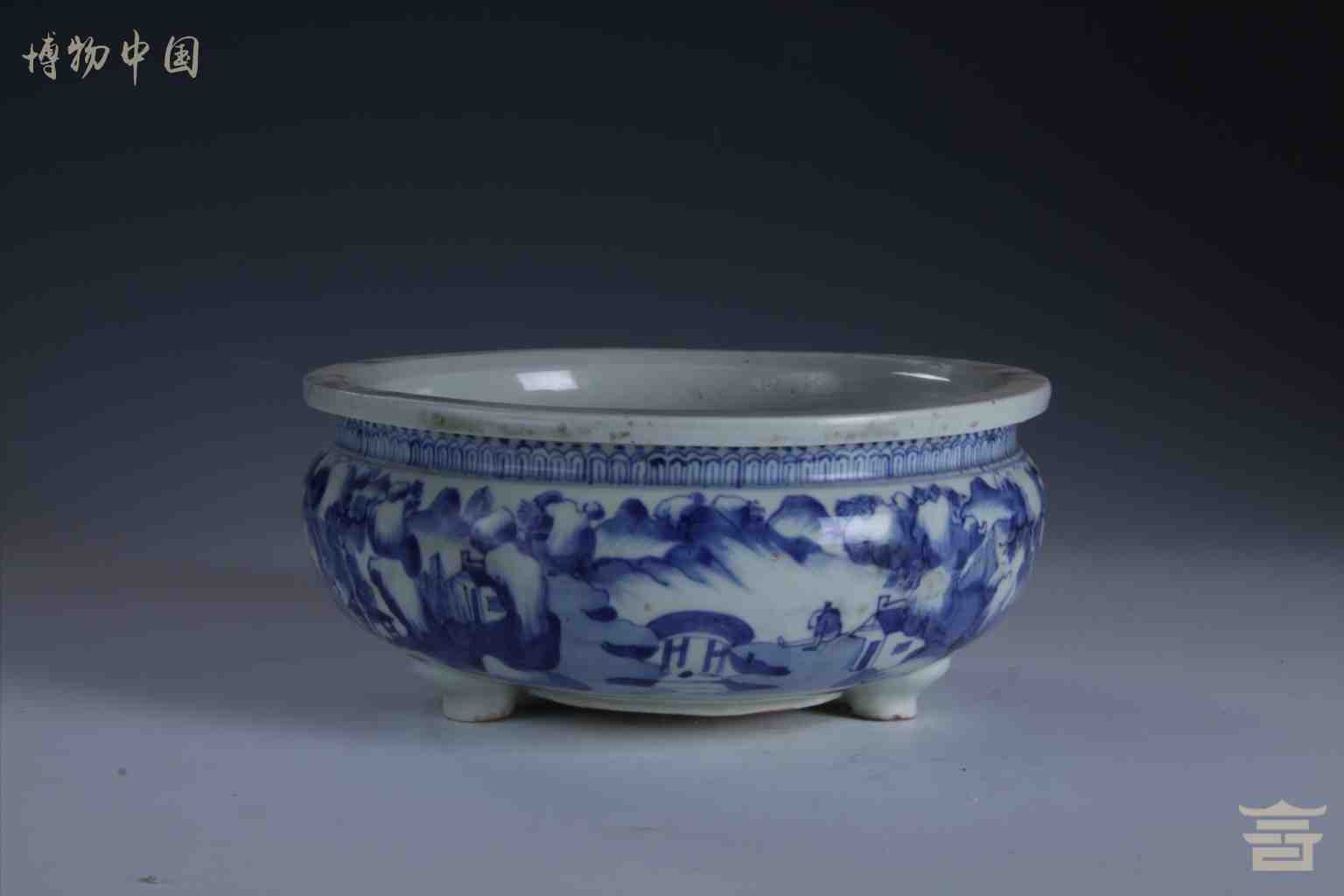 > 清德化窑青花山水人物纹三足瓷炉