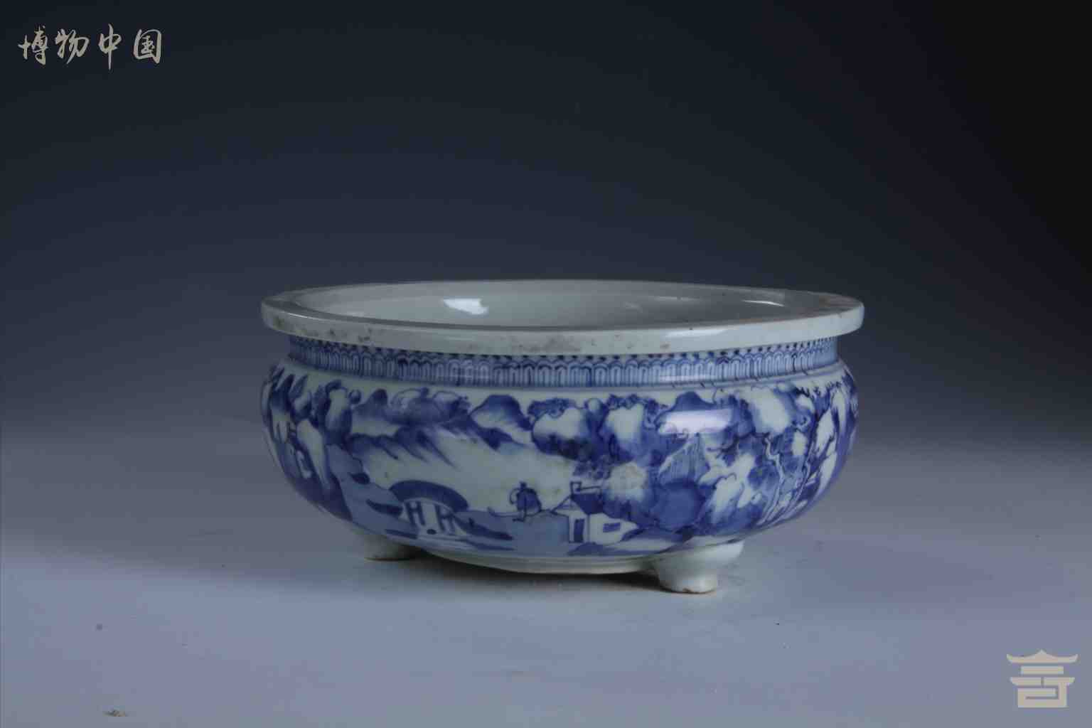 清德化窑青花山水人物纹三足瓷炉