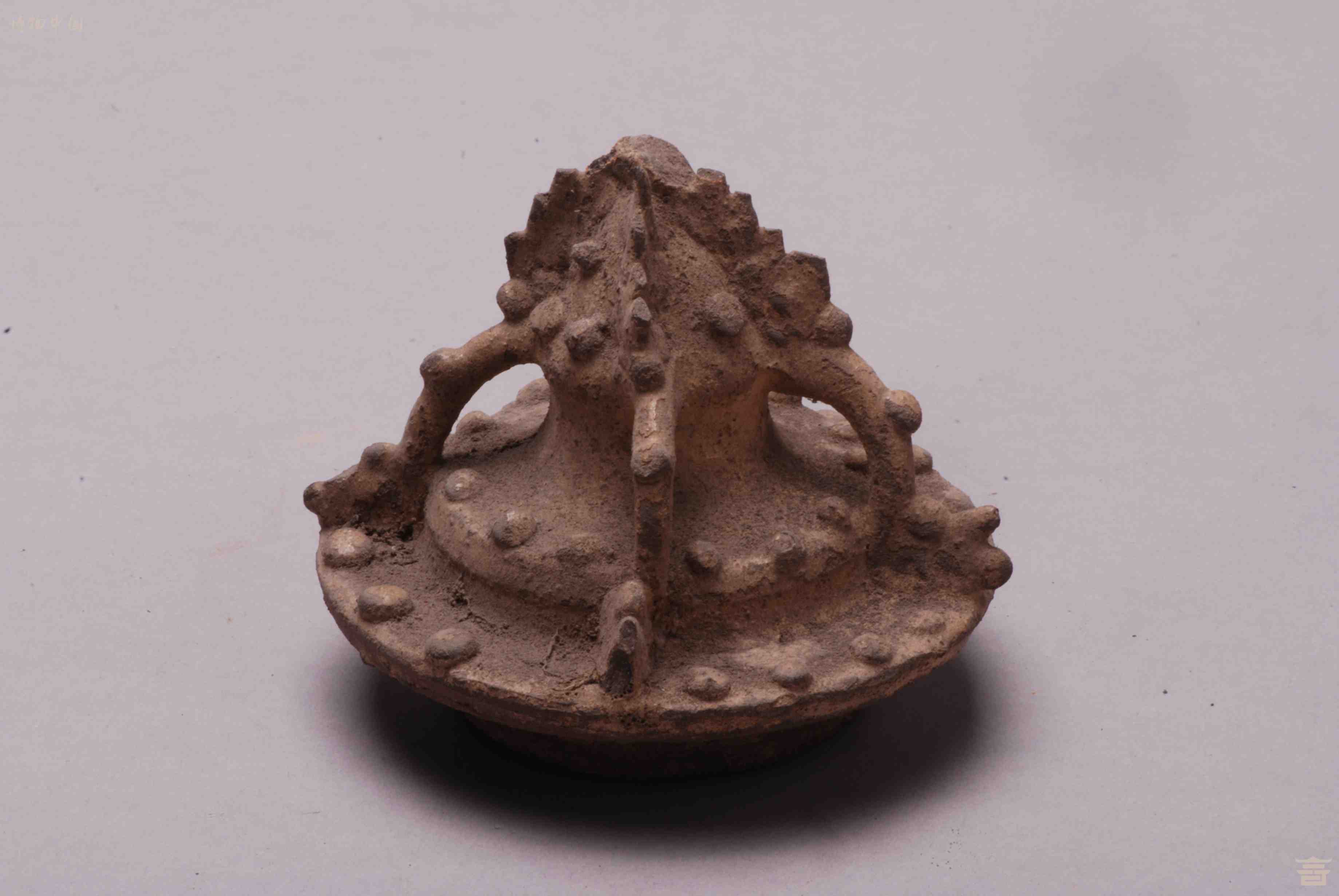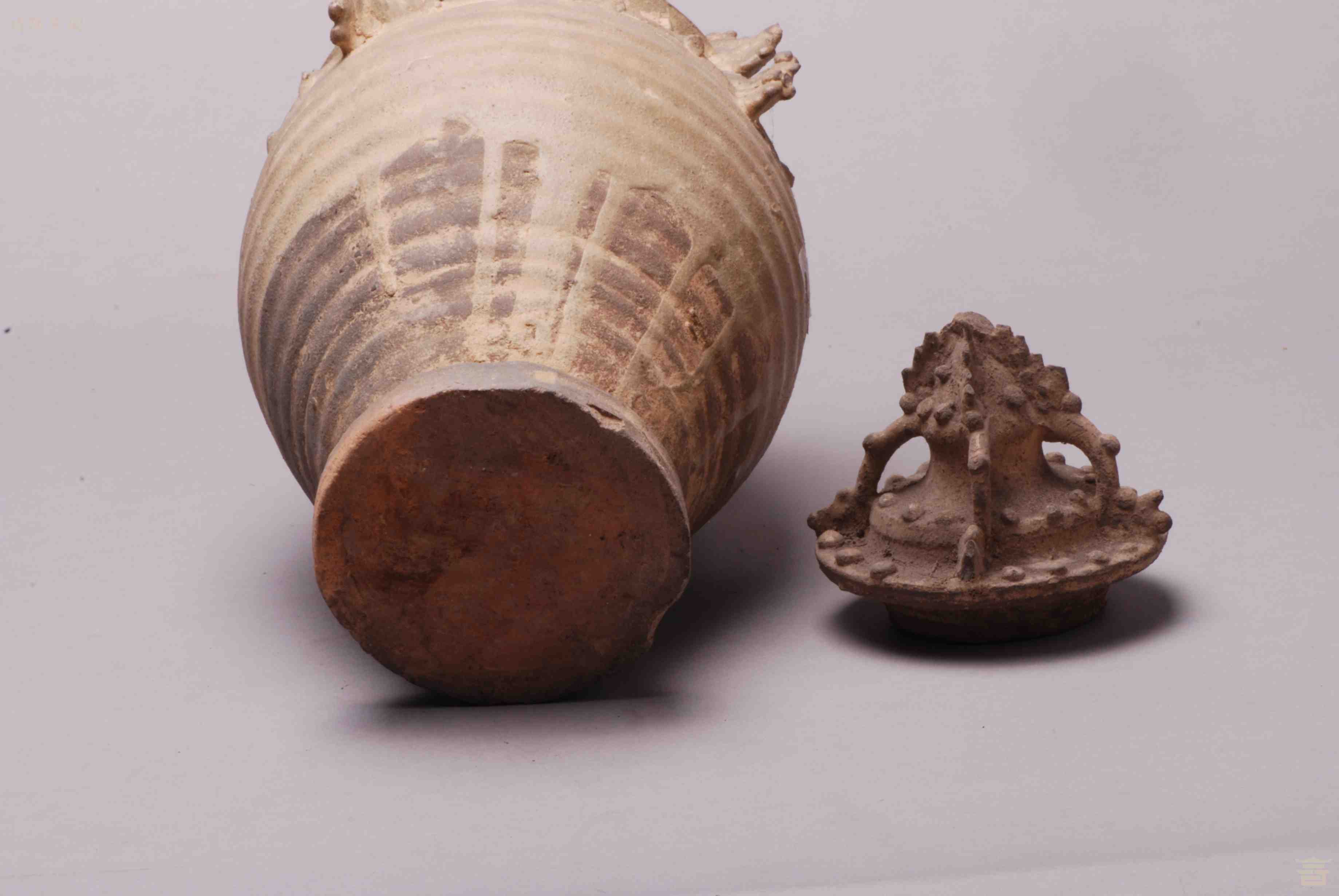 > 明青黄釉重檐塔式带盖陶谷仓罐